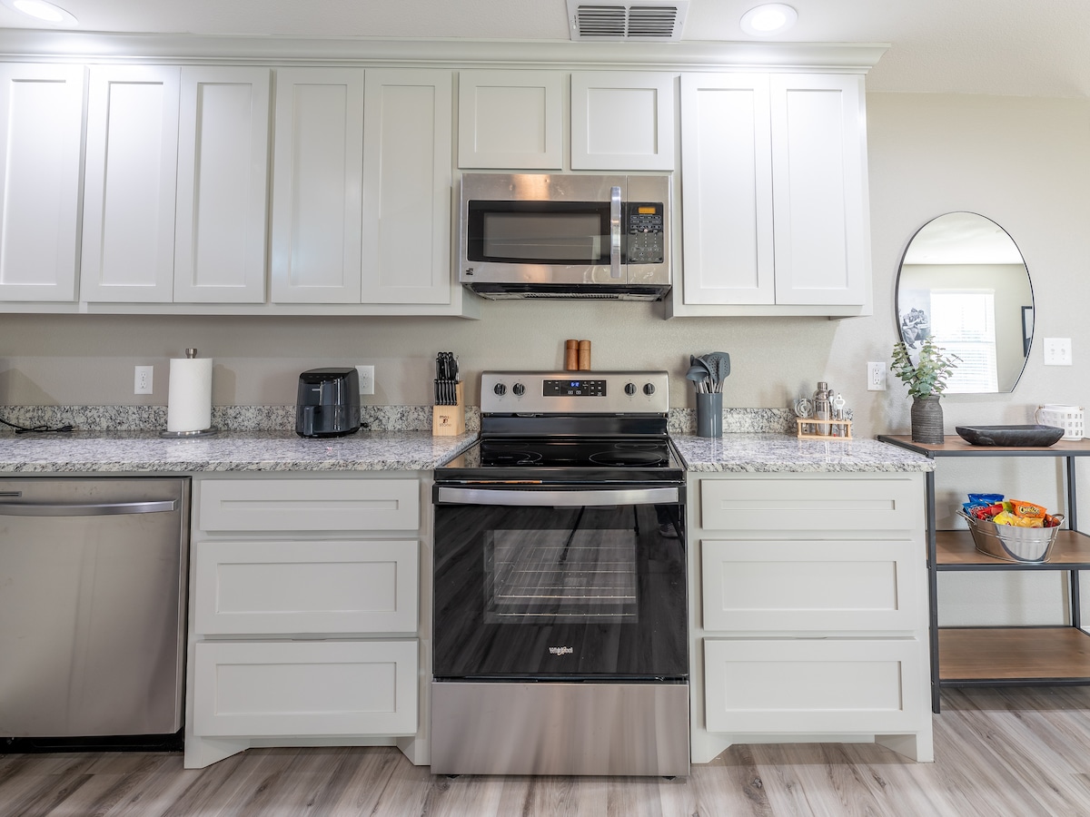 Situat central în apropiere de diverse restaurante și cumpărături, la mică distanță. Baie spațioasă 1BR 1 cu plan deschis pentru bucătărie/sufragerie. Unitatea noastră oferă Wi-Fi gratuit, intrare fără cheie și bucătărie completă. Lenjerii de pat, prosoape, fier de călcat/masă de călcat și mașină de spălat/uscător pot fi găsite într-un dulap spațios. Dormitorul are pat matrimonial, birou și fiecare cameră are Amazon Fire Smart TV cu telecomandă pentru a accesa mai multe aplicații de streaming Un mic patio este situat în afara zonei de living, cu scaune și spațiu pentru animale de companie.