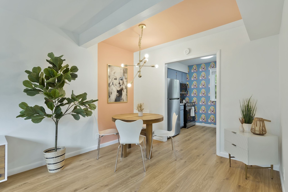 Welcome to Dolly Vibes Only, a 1-bedroom, 1-bath retreat full of Dolly Parton flair in the heart of Sylvan Park! Just a mile from Vanderbilt and 2 miles from the buzz of Lower Broadway, this ever-so-Dolly chic retreat brings Nashville to your doorstep with all the glitz and glam of Dolly herself!. Enjoy the cozy outdoor space with Adirondack chairs and café lights at the end of the day. It’s perfect for play or a “9 to 5” work day.