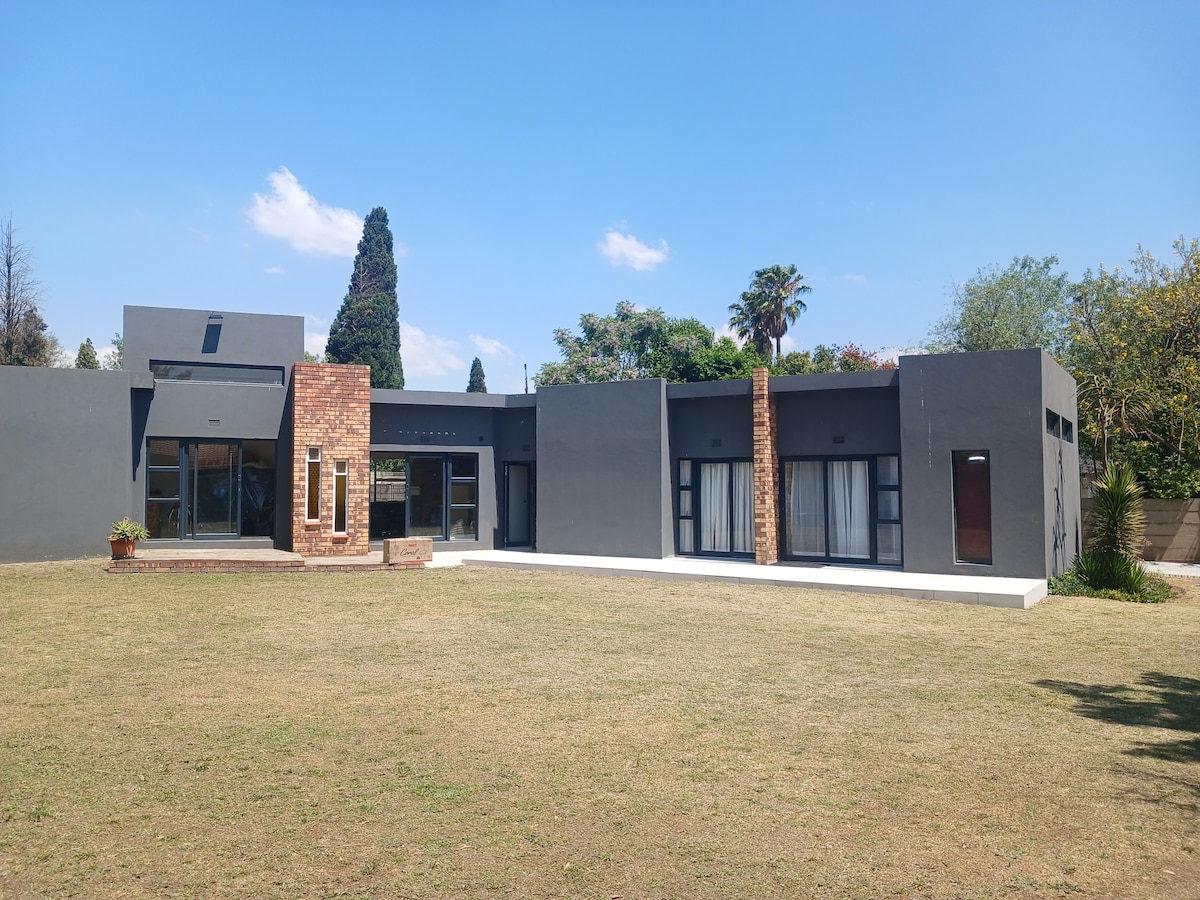 Kick back and relax in this calm, stylish space. Offering a comfortable room, stunning patio views & a pool. Relax and enjoy free Wi-Fi, Netflix and Air-conditioning - you will feel right at home. Our guesthouse has solar power and continuous water due to our borehole so you won't feel any inconvenience from loadshedding.
