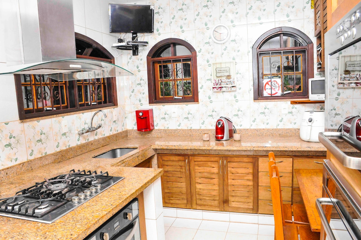 Linda casa de campo em Miguel Pereira c/ 4 suítes e espaço integrado com cozinha, churrasqueira, televisão, sala de estar e lazer. Ambiente super aconchegante, cercado de uma paisagem deslumbrante. Perfeito para um encontro de família e amigos (até 18 adultos) que buscam por um ambiente relaxante e ao mesmo tempo próximo do centro da cidade (3 min de carro ou 10 a pé). Piscina, Churrasqueira, Mesas de Sinuca e Ping-Pong, Quadras de Vôlei e Futebol. WI-FI. Cozinheira/arrumadeira opcional.