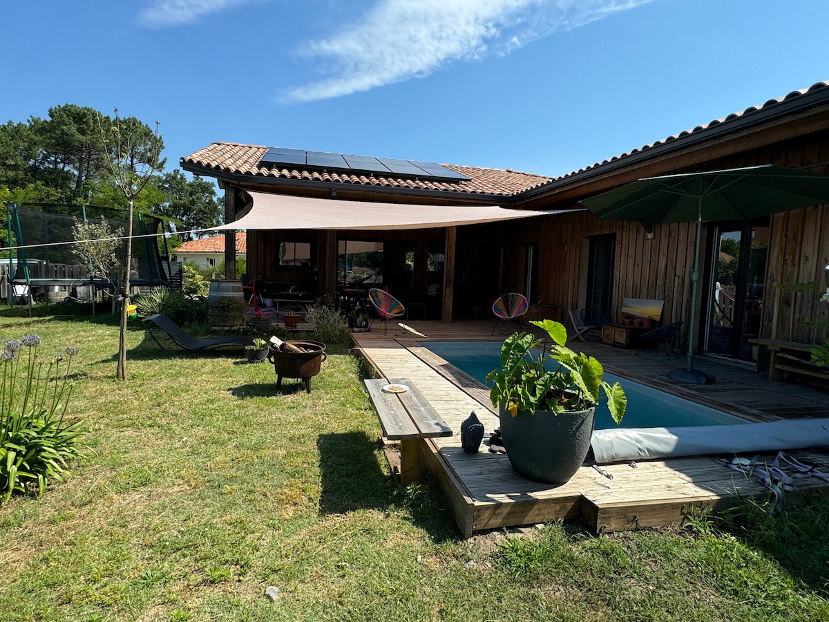 Casă din lemn de 150 m2 cu piscină încălzită. (Nu este disponibilă de la 1 noiembrie până la 1 aprilie). Poate găzdui 8 persoane. Situat între Mimizan Bourg și plajă, (pistă de biciclete la 150 m de casă) Living mare, bucătărie utilată, living. 4 dormitoare (1 cu 180 de paturi, 2 cu 140 de paturi, 1 cu 2 paturi în 90) opțiunea de a adăuga un pat cododo 2 băi, 2 Toaletă Terasă cu dotări (plancha, grătar, mobilier ...) Wi-Fi, fără TV Închiriere pentru minimum 2 nopți.