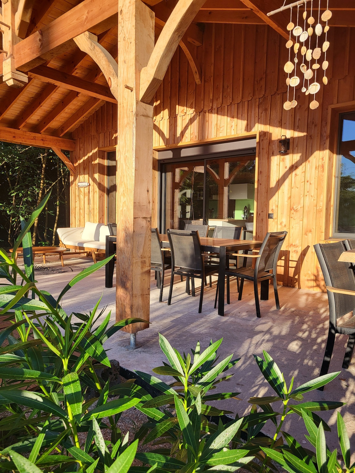 notre maison en bois située dans un quartier calme en lisière de forêt, se compose d' une chambre (lit 160x200) avec salle d'eau, d une seconde chambre (2lits 90x190)avec salle d'eau ; d'une mezzanine avec 2 lits (1 lit 90x 190 et 1 lit 140x190) et un espace enfant avec jouets et livres. un salon, cuisine equipée, une grande terrasse abritée, plancha pour profiter de vos vacances en famille ou entre amis. vous pourrez profiter du jardin arboré et clôturé d environ 400m2. Parking privé