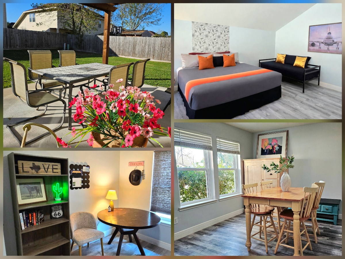 Indiferent dacă călătorești singur, în cuplu sau chiar în familie, casa noastră de oaspeți liniștită este gata pentru șederea ta. Casa, situată în curtea din spate a reședinței noastre principale, este de aproximativ 600 mp, cu un dormitor, living și o bucătărie completă cu un frigider mic. Zona este complet împrejmuită pentru intimitate, împreună cu o curte pavată și mobilier. Suntem la mai puțin de 10 minute de SH 288, la 45 de minute de plaje, la 30 de minute de Texas Medical Center, la 15 minute de Pearland Town Center, la 20 de minute de SkyDive Spaceland.