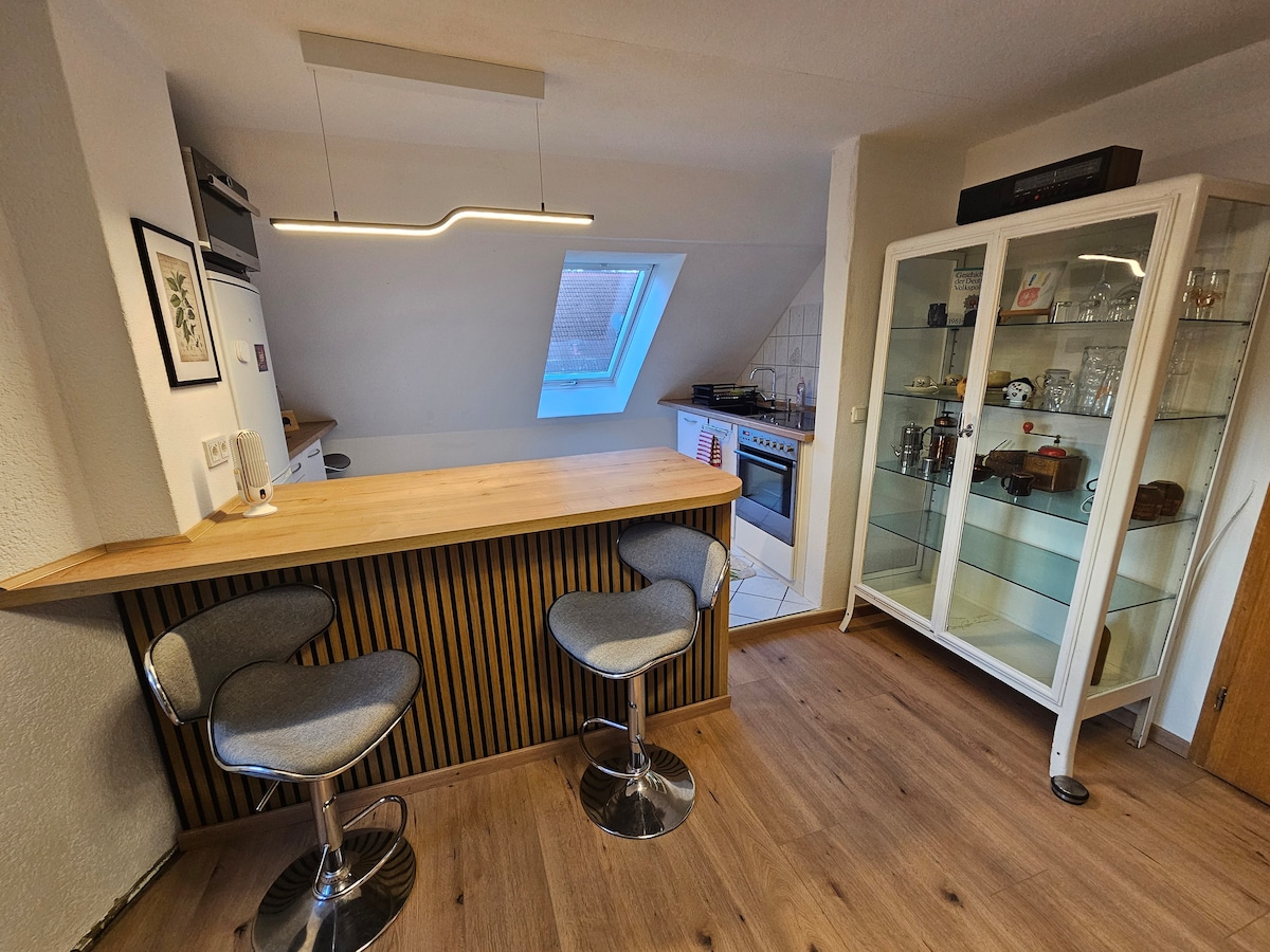 Bine ai venit în apartamentul nostru elegant de pe acoperiș din mediul rural! Bucură-te de liniștea de pe terasa mare de pe acoperiș și de priveliștea prin ferestrele din podea până în tavan din livingul luminos. Bucătăria deschisă și modernă este complet utilată. Dormitorul principal oferă confort deplin, în timp ce a doua cameră are o canapea extensibilă confortabilă (zonă de 120 x 200 cm). Perfect pentru până la 4 oaspeți. Parcare gratuită disponibilă. Ideal pentru iubitorii de natură care caută relaxare și confort!