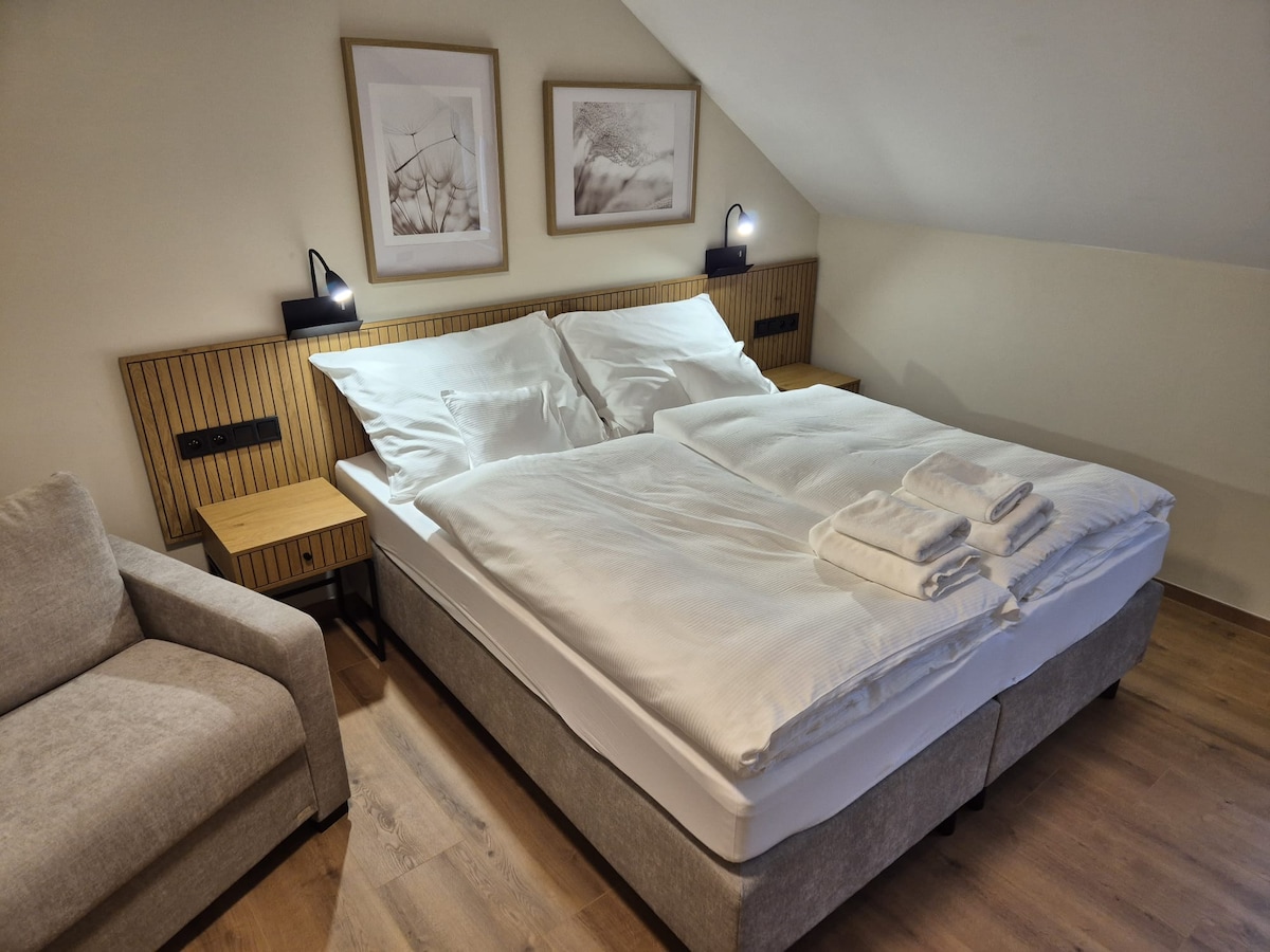 Bucură-te de un apartament recent renovat, elegant, într-o vilă istorică situată în inima Geoparcului Ralsko. Acest spațiu fermecător are o grădină privată împrejmuită, cu un iaz și un grătar, perfect pentru relaxare în intimitate totală. Apartamentul include un dormitor, un living spațios cu o canapea extensibilă mare și confortabilă, o bucătărie complet utilată și o baie cu duș și acces direct la grădină. Oaspeții beneficiază de Wi-Fi gratuit, parcare gratuită și check-in independent convenabil.