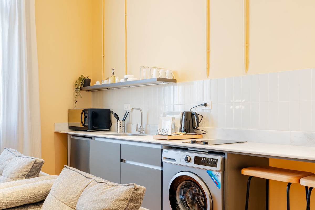Bine ai venit în șederea ta perfectă în oraș — un apartament studio confortabil, curat și atent proiectat, cu un pat matrimonial confortabil și o zonă de living confortabilă. Studioul are vedere la un vechi palat în stil englezesc, oferind o vedere liniștită, dar pitorească, asupra arhitecturii istorice. Ieși afară și te vei afla în inima unei străzi pline de viață, înconjurată de unele dintre cele mai bune restaurante, cafenele și locuri locale pe care orașul le oferă — toate la câțiva pași.
