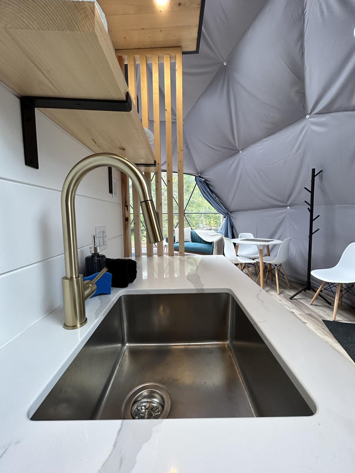 Descoperă rafinamentul de glamping cu cupolele noastre de design șic și contemporan, concepute pentru a găzdui până la 4 persoane, situate direct lângă marginea lacului. Aceste unități sunt îmbunătățite cu un centru spa cu lemne pentru relaxare maximă. Fiecare cupolă este dotată cu o chicinetă, un minifrigider, o baie completă, două paturi queen-size, o canapea, o zonă de luat masa și o sobă cu lemne pentru a te învălui în căldură. Vino să experimentezi viața captivantă în aer liber în inima complexului nostru fermecător