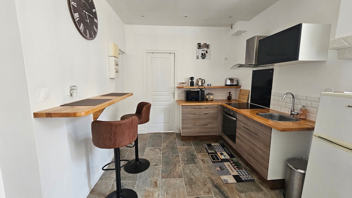 Vino să te relaxezi în această casă caldă și luminoasă, complet renovată și renovată! Îi vei aprecia farmecul și calmul. Veți avea un dormitor și, de asemenea, o canapea extensibilă care este potrivită pentru copii să vină în cuplu sau familie, avem, de asemenea, un pătuț și un scaun înalt pentru copii la cerere. Această locuință se află în La 50 de metri de un supermarket. Avem o parcare privată discretă. Spațiul trebuie curățat.
