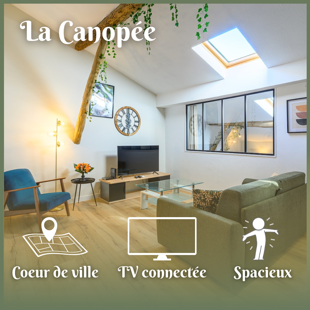 Vrei să-ți faci șederea în Montauban DE NEUITAT și AUTENTICĂ? 🍃 Bun-venit la La Canopée, un cocon de plante ÎN INIMA ORAȘULUI INGRES. Un apartament duplex LUMINOS și SPAȚIOS, conceput pentru a găzdui 6 CĂLĂTORI în căutare de energie și vibrații bune. Culorile vibrante, atmosfera exotică și confortul modern se reunesc pentru a te cufunda într-un loc dinamic, vesel și inspirator. Ideal pentru a împărtăși, a te relaxa și a experimenta orașul cu optimism.