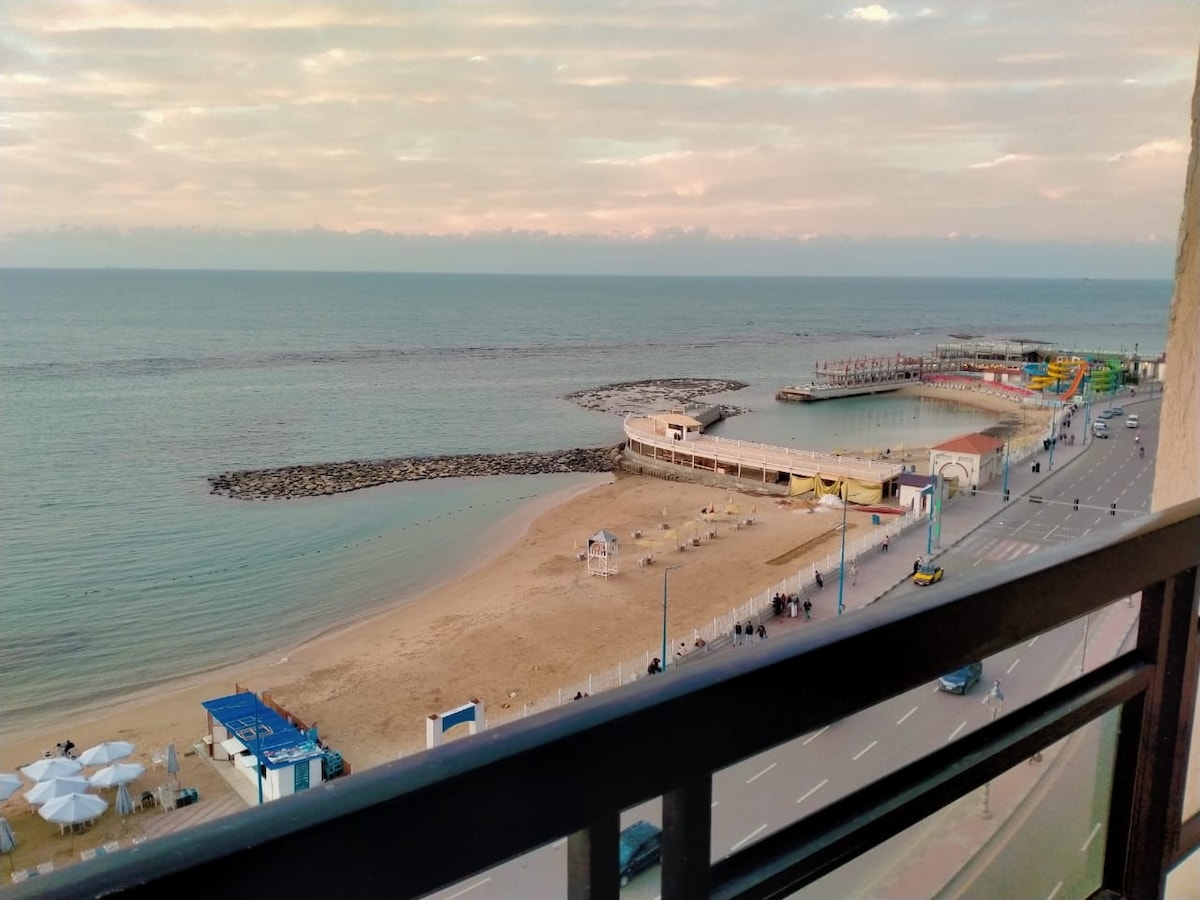 A distinguished apartment on the beach of Alexandria in the Montazah area. It consists of three bedrooms with 6 beds, two bathrooms, a large hall containing a dining room, a salon, and a living room. In addition to a sea view across the width of the hall. And a large balcony containing a sofa and chairs made of wicker and classic beads. The apartment is located on the ninth floor, giving it a unique view of the beach that you will never see before.
