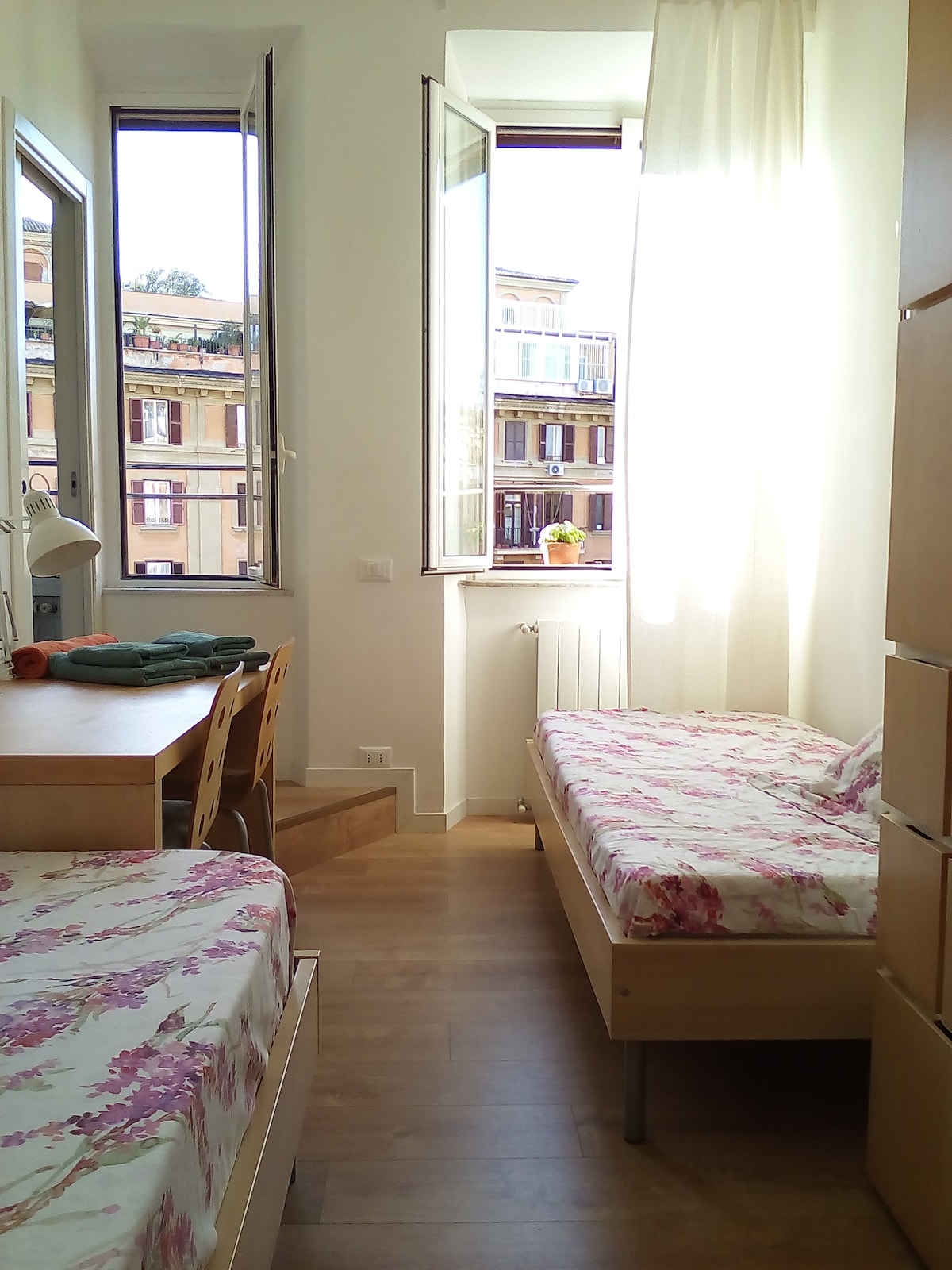 Quiet and bright, but the ‘movida’ of Trastevere is around the corner.. Here you will sleep well. Welcome with snacks. Living room with a double sofa bed, bedroom with two single 2m. beds. Two twins complete bathrooms, useful when you go in and out all at the same time. Both rooms refreshed by ecofriendly ceiling fans. An indipendent fully equipped kitchen. Washing machine. 4th floor without elevator but comfortable and bright stairs. Schedule flexibility. FREE WIFI. Free luggage storage.