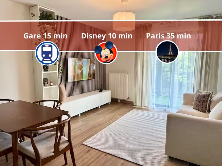 Vous recherchez un appartement confortable et bien situé, à proximité de Disneyland Paris ? Venez découvrir notre studio moderne et cosy. Idéalement situé, à 3 minutes à pied de la gare RER, à une station du parc Disneyland. Profitez de nombreux restaurants et commerces proche de l'appartement, ainsi que le centre commercial Val d'Europe et La Vallée Village pour une expérience shopping unique. Tout est accessible à pied pour un séjour confortable et pratique après une journée de découvertes