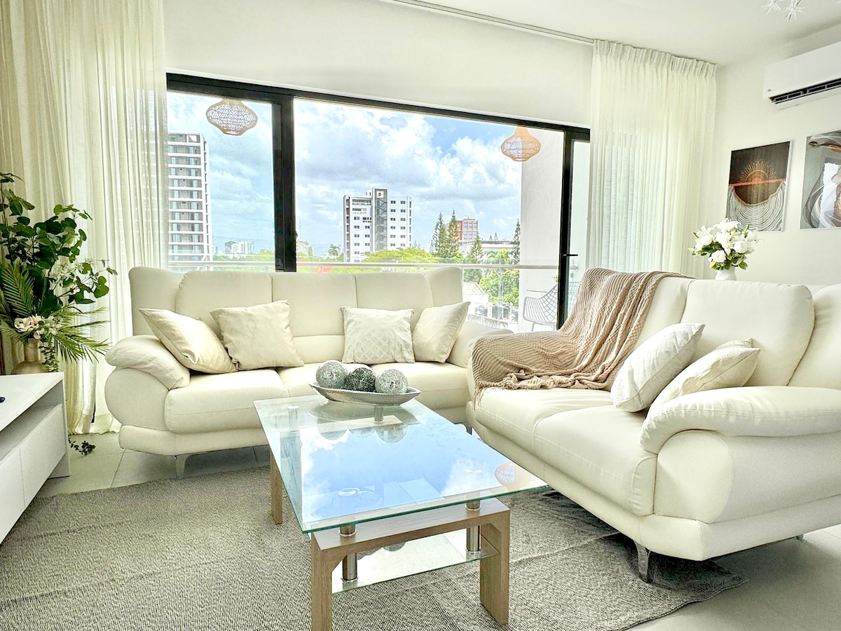 APARTAMENT NOU modern în turnul Rialto de la etajul 12, cu o priveliște uimitoare a orașului Santiago. Este un spațiu confortabil și bine iluminat, cu două televizoare inteligente de 50"și Wi-Fi stabil, cu o viteză de 100 Mbps. Bucătărie generoasă bine echipată și o baie curată și spațioasă. O piscină fantastică pe acoperiș cu cea mai bună priveliște asupra orașului. Parcare privată. Apartamentul este situat într-un complex nou, cu securitate non-stop. Apartamentul este situat central în cartierul La Esmeralda. Toate sunt accesibile pe jos!
