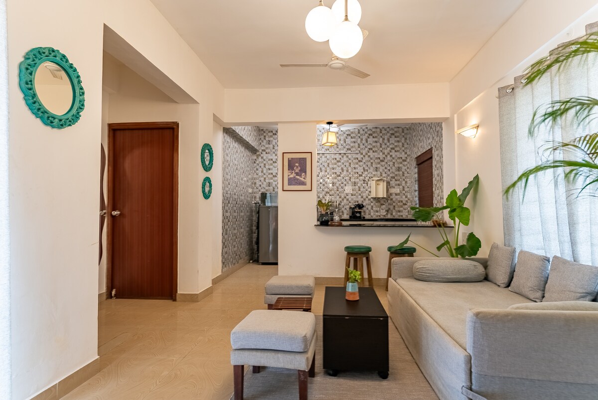 It is a cozy and comfortable abode, yet spacious and luxurious 1BHK apartment in the heart of Siolim, max 15 mins drive to famous beaches of Vagator, Anjuna and Morjim. A fully loaded chic and eclectic house, it has all the amenities to make your stay comfortable and hassle free, high speed internet, fully functional kitchen, access to huge pool and gym, exactly what a ‘Susegad’ Stay looks like! We have 24 hours security, power backup and housekeeping facilities, car parking for all our guests.