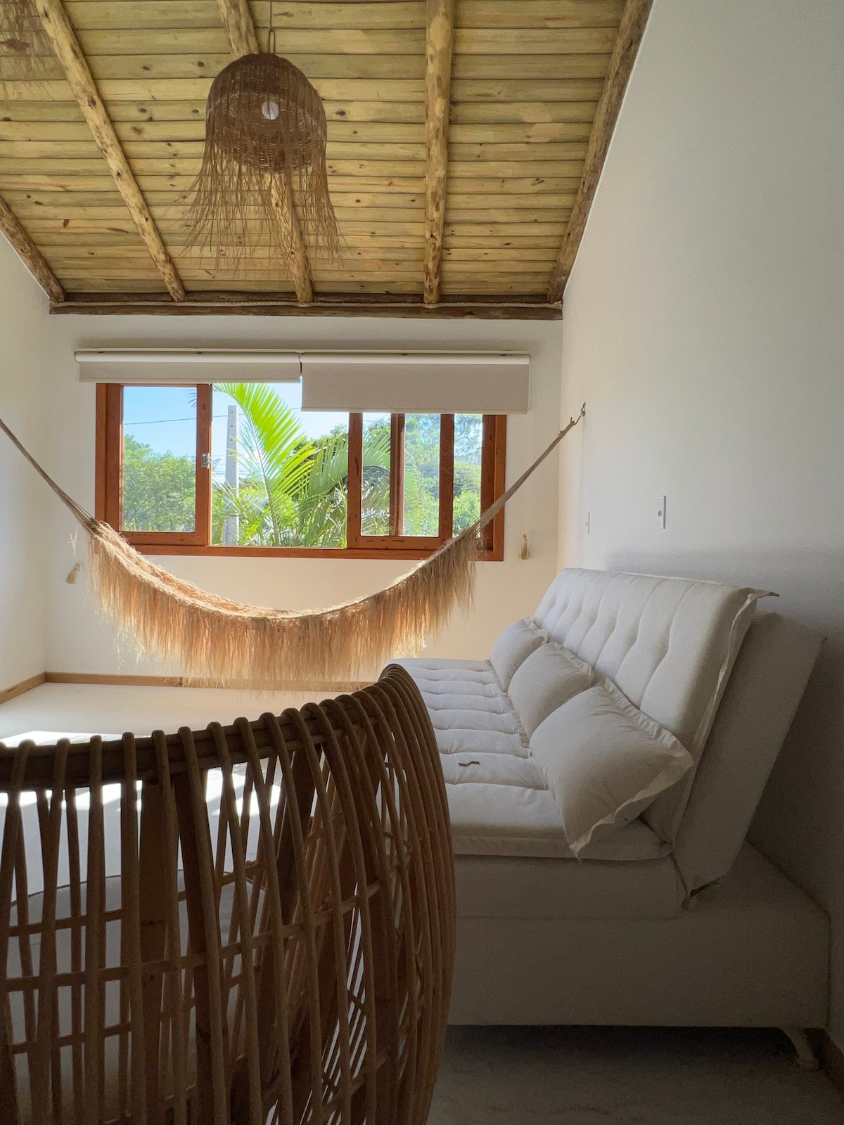 O căsuță pe nisipul situată la marginea plajei Guarda do Embaú! Aproape de centru și de toate lucrurile bune aici: plaje, trasee, coastă, mare, râu, bărci, surfing, balene (sezon din iulie până în noiembrie). Și comerțul cu magazine, baruri, cafenele, restaurante, piață... Trebuie doar să sosești și să te bucuri de tot pe jos! Casa este împărțită în trei, dar numai două sunt utilizate pentru închiriere. Poarta de acces este aceeași pentru toată lumea, grădina este o zonă comună și fiecare casă are propriul balcon privat.