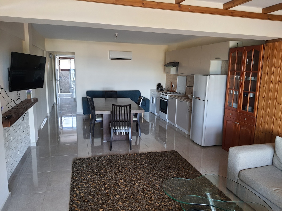 LUXURIOUS AND COMFORTABLE AND LARGE APARTMENT 80 SQM WITH 2 BEDROOMS. AND A COMFORTABLE KITCHEN AND LIVING ROOM IN A VERY QUIET AREA WITH A VIEW OF THE WONDERFUL SUNSET OF POMOS WHICH COMBINES MOUNTAIN AND SEA. THE APARTMENT IS 200 METERS FROM THE SEA.