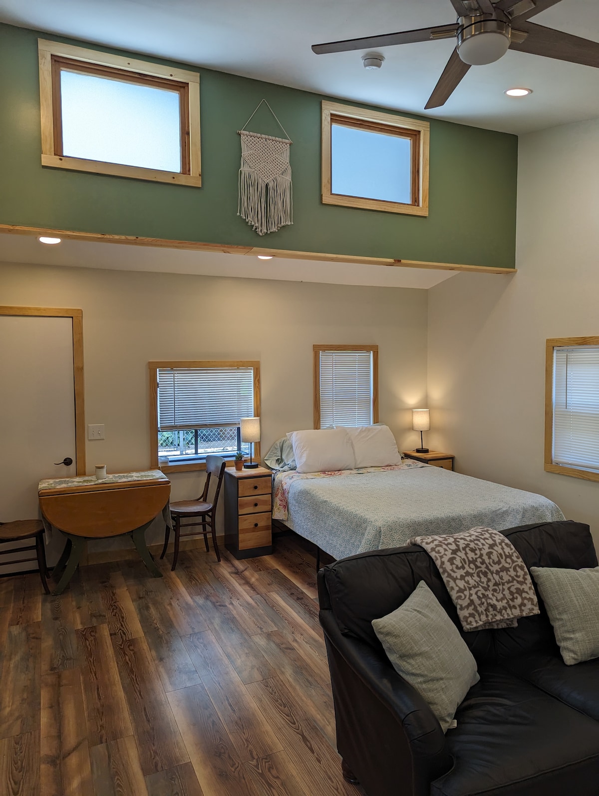 Mansardă cu un dormitor peste două garaje auto cu living mare. Un singur garaj este disponibil pentru chiriași, acesta este locul unde se află mașina de spălat și uscătorul și o sală de jocuri cu masă de bar și tablă de darts. Dormitorul are pat matrimonial. Baie completă cu cârpe de spălat și prosoape suplimentare. Bucătărie complet aprovizionată, cu vin și cafenea . Aproape de toate zonele cu trei orașe. Aproape de parcul de pe malul râului și de centura verde, unde poți merge cu bicicleta sau pe jos . Puntea acoperită din spatele mansardei are grătar cu gaz, groapă de foc cu gaz, masă bistro.
