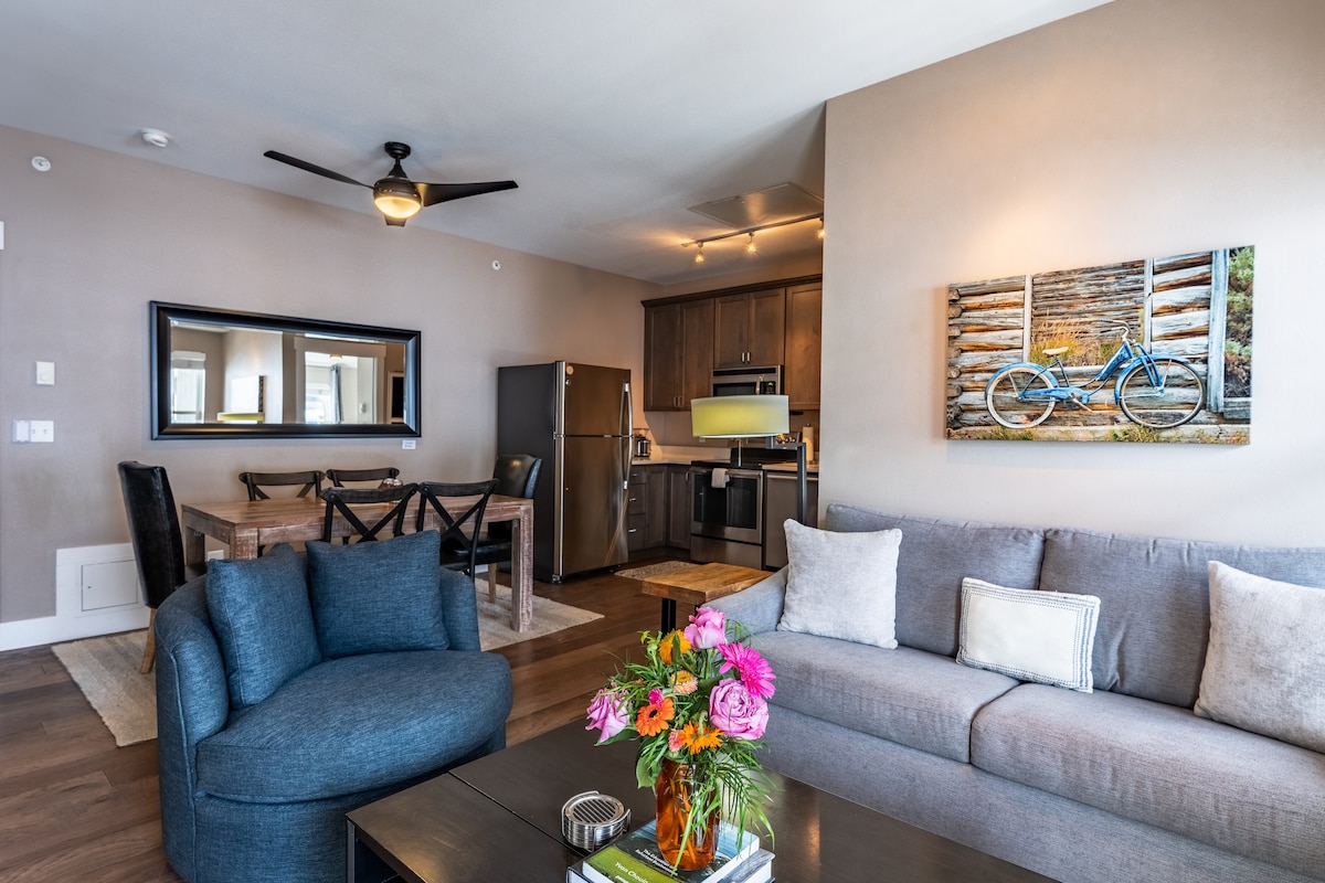 Un apartament luxos, luminos, la etajul trei, cu priveliști incredibile și o locație de neegalat.Garaj privat încălzit și dulap privat pentru schiuri în hol! Este situat central - la o scurtă plimbare de 60 de metri până la teleschiuri și la schiuri la sfârșitul zilei.Relaxează-te în cada cu hidromasaj comună sau fă un puzzle, joacă jocuri sau citește o carte lângă șemineu. Stația de autobuz pentru transportul gratuit spre oraș este chiar vizavi, iar delicioasa cafenea Coffee Lab este la o scurtă plimbare de la ușa din față a clădirii!