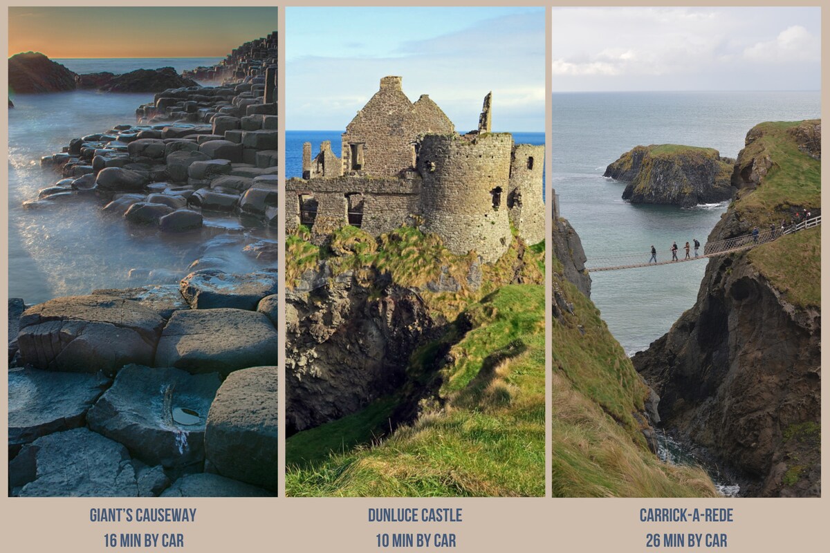 Situat la mai puțin de 5 minute de mers pe jos de o întindere de 2 mile de plajă cu steag albastru nisipos auriu. Locația noastră unică se uită direct peste Oceanul Atlantic și este literalmente la malul apei; pulverizarea din Oceanul Atlantic va lovi de fapt fereastra! Este la câțiva pași de toate pub-urile și restaurantele excelente pe care Portrush le are de oferit și este o bază ideală pentru a explora toate minunile Coastei de Nord.