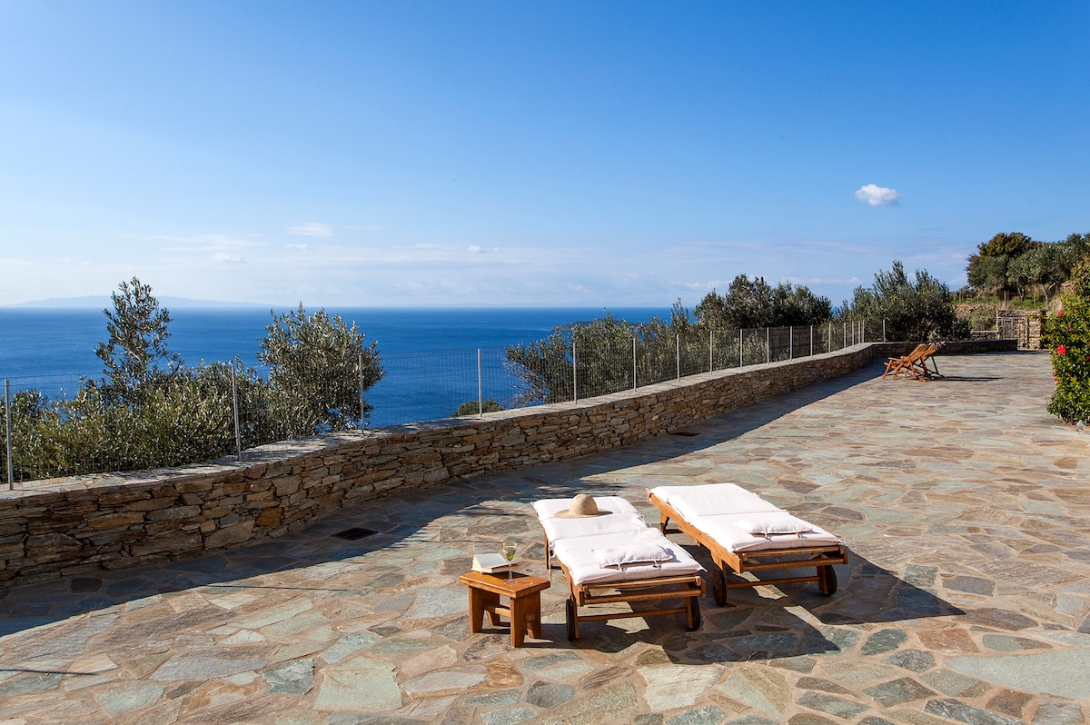 O casă de vară familială recent terminată, formată din două unități de locuit independente, cu verande vaste și o grădină luxuriantă de măslini, este scena unei vacanțe de neuitat pe cea mai polimorfă insulă a Cicladelor.
