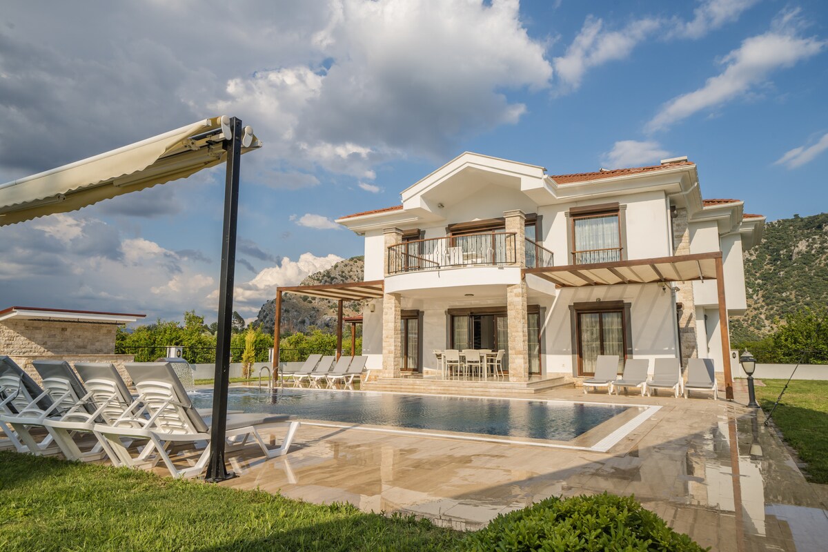 VILĂ DE VACANȚĂ CU CATERING AUTONOM DE ÎNCHIRIAT ÎN DALYAN Vilă | 5 dormitoare | 4 băi | 11+2 persoane Această vilă privată modernă cu 5 dormitoare, cu piscină privată construită într-una dintre cele mai frumoase zone din sud-vestul Turcia, numită Dalyan. Această vilă cu cinci dormitoare este mobilată individual la un standard foarte ridicat, deoarece toate facilitățile moderne, inclusiv aerul condiționat în fiecare cameră, podelele din marmură și băile noi bine renovate.