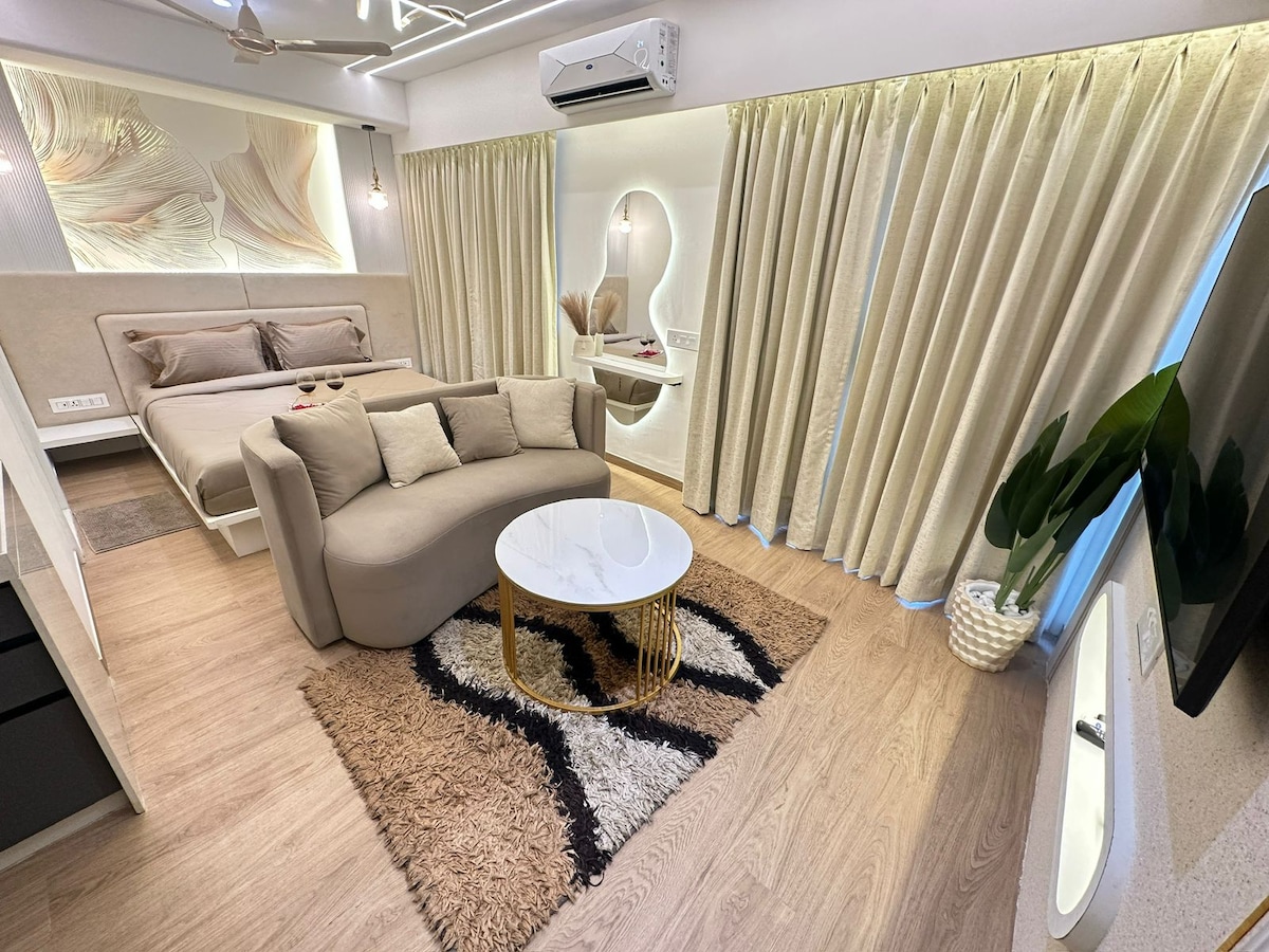 Welcome to Pune Airport's Finest Lounge Studio, a thoughtfully designed studio apartment in Viman Nagar, just minutes from Pune Airport. Get a peaceful nap with a cozy king size bed, luxe interiors. Thoroughly cleaned and a peaceful space. Unwind with coffee breaks in the ambient lighting, and a peaceful vibe that makes every layover or stay feel effortless. Perfect for business travelers, couples, or anyone who loves a stylish pause before takeoff.