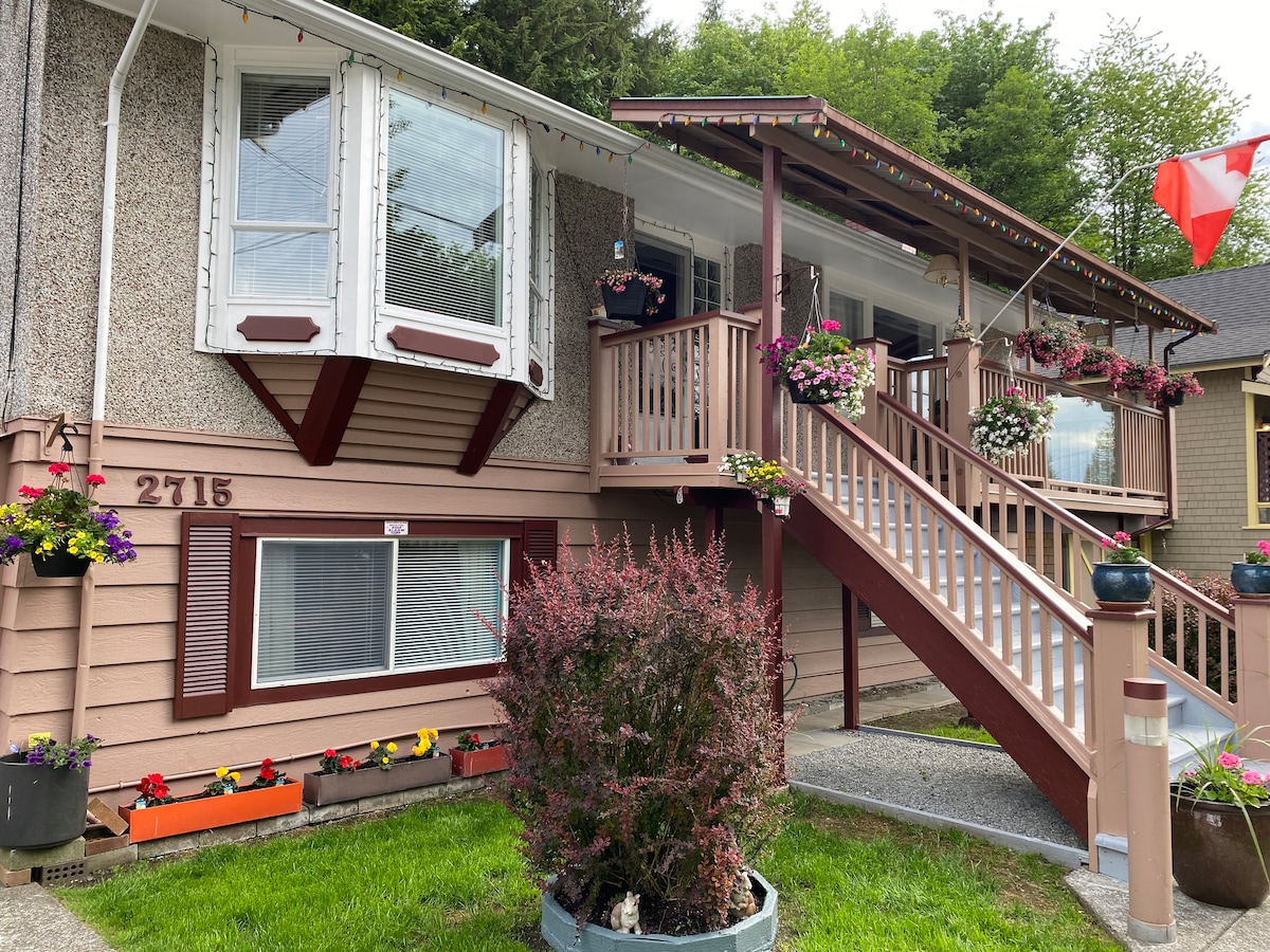 Sunny Nest, foarte luminos și spațios, apartament confortabil cu 1 dormitor, cu living, bucătărie și baie; totul doar pentru tine. Există, de asemenea, cameră la soare (comună cu gazda) cu acces la grădină și terasă imensă la soare, unde te poți bucura de vedere spre sud asupra orașului. Locație convenabilă în Coquitlam-Millardville. Opțiunea de a verifica independent cu cheia în caseta pentru chei. Casa este situată pe versantul dealului; există trepte de acces confortabile (2 x 8 trepte) de la parcarea inferioară până la apartament.