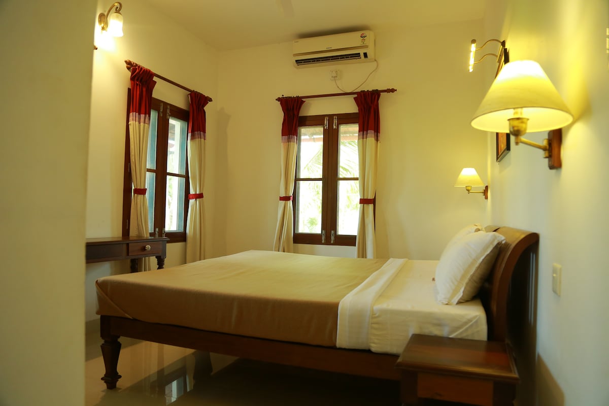 Experimentează o evadare romantică în vila noastră premium cu un dormitor, situată pe malul lacului din Varkala, concepută exclusiv pentru cupluri. Bucură-te de priveliști liniștite ale lacului din dormitor și cadă, relaxează-te pe terasă sau petrece-ți ziua făcând caiac și pescuit pe apele calme. Cu mic dejun și cină gratuite, această vilă combină confortul, intimitatea și natura pentru o escapadă de neuitat pe malul lacului.