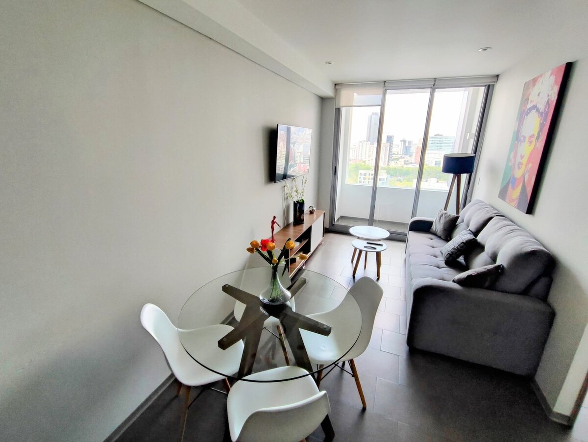 Apartament nou, cu design modern la cinci străzi distanță de Bulevardul Masaryk. Apartamentul se află în inima uneia dintre cele mai la modă zone ale orașului, în apropiere de muzee, o varietate de restaurante, cinematografe, baruri și centre comerciale. Zona este foarte plăcută de mers pe jos, iar locația sa strategică vă permite să vă conectați în câteva minute cu Paseo de la Reforma, Muzeul de Antropologie și Îngerul Independenței. Clădirea are o sală de gimnastică, co-working, terasă cu vedere bună și zone comune.