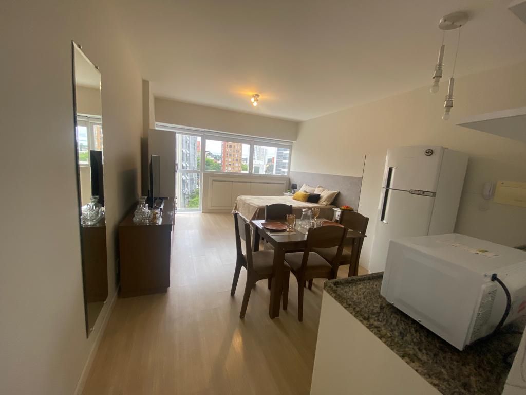 Garsonieră modernă, nou-nouță, confortabilă, perfectă, cu o vedere frumoasă de la balcon, mai ales noaptea . Wi-Fi rapid, birou, TV inteligent de 55”, pat matrimonial. Aer condiționat (cald/rece). Mașină de spălat și uscător automat de rufe și o insulă frumoasă în bucătărie. 50m2 de stil foarte 27, Liniște. În centru/Batel, aproape de magazine, bănci, mall-uri, centru gastronomic și spital . În clădire :piscină, sală de gimnastică, sală de jocuri, saună, jacuzzi, concierge non-stop.