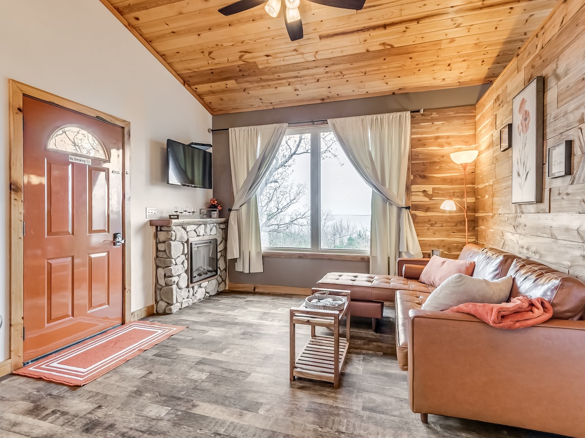 Casă frumoasă în copac mobilată, ridicată la 5 metri deasupra solului, este perfectă pentru 2 adulți. Finisat cu pin, cedru și tavane boltite, surprinde fiecare centimetru de frumusețe naturală cu ferestre supradimensionate în living și dormitor. Bucură-te de puntea 10 x 10 în timp ce admiri linia superbă a copacilor și priveliștea spectaculoasă a lacului în timp ce faci grătar. Perfect pentru a sărbători o ocazie specială sau pentru a scăpa de oraș. Relaxează-te în cada cu hidromasaj cu o băutură sau relaxează-te în fața șemineului. Taxă pentru animale de companie de 50 $ - maximum 2