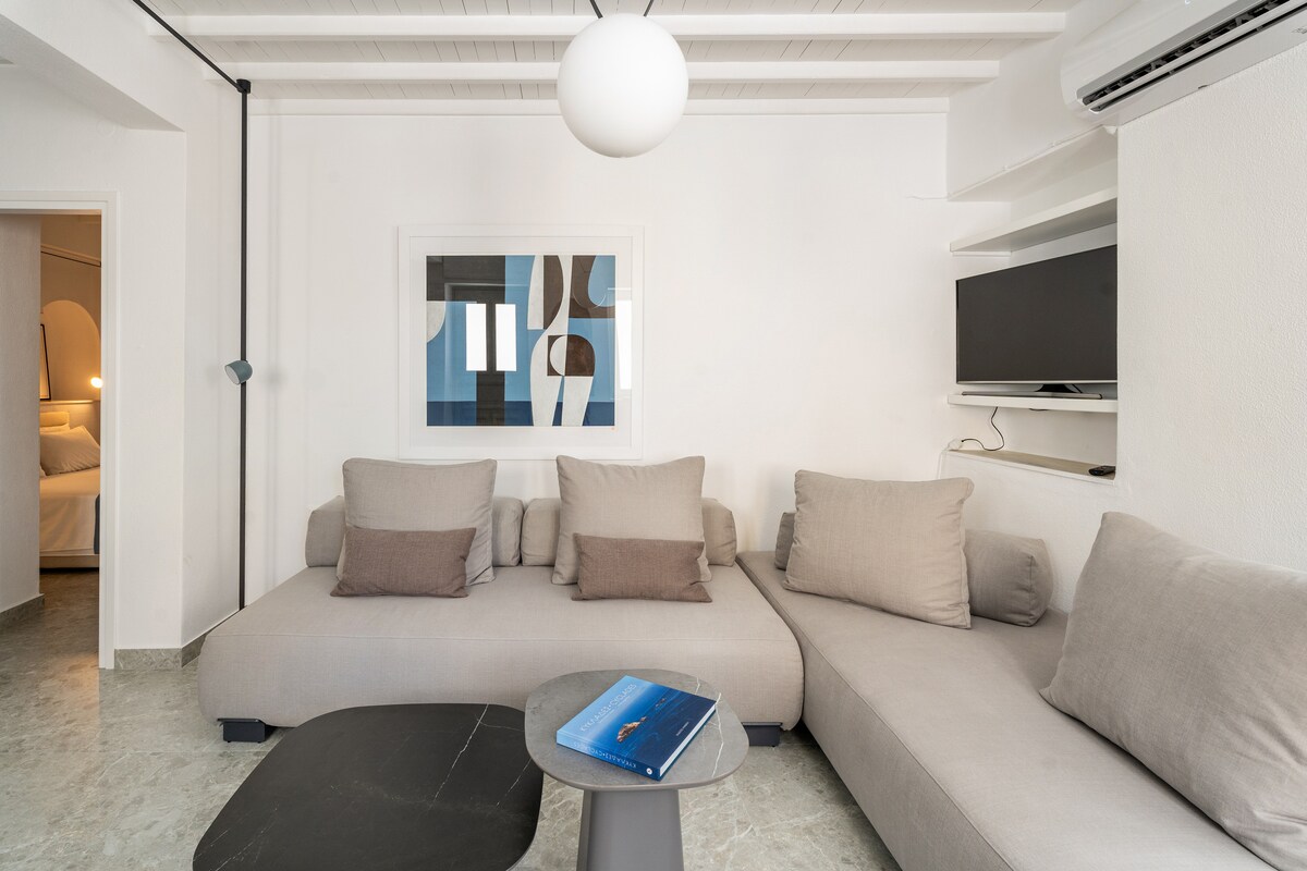 Camera este formată dintr-un pat dublu , minibar, cafetieră espresso, TV inteligent, aer condiționat și baie privată cu duș electric. Există un balcon privat cu priveliști uimitoare ale orașului Mykonos și și vedere la apus în fiecare noapte a șederii tale. Wi-Fi gratuit este, de asemenea, disponibil gratuit pentru toți oaspeții. Camera este situată la o sută (100) de metri de plaja Restaurante și baruri din centrul orașului Mykonos.