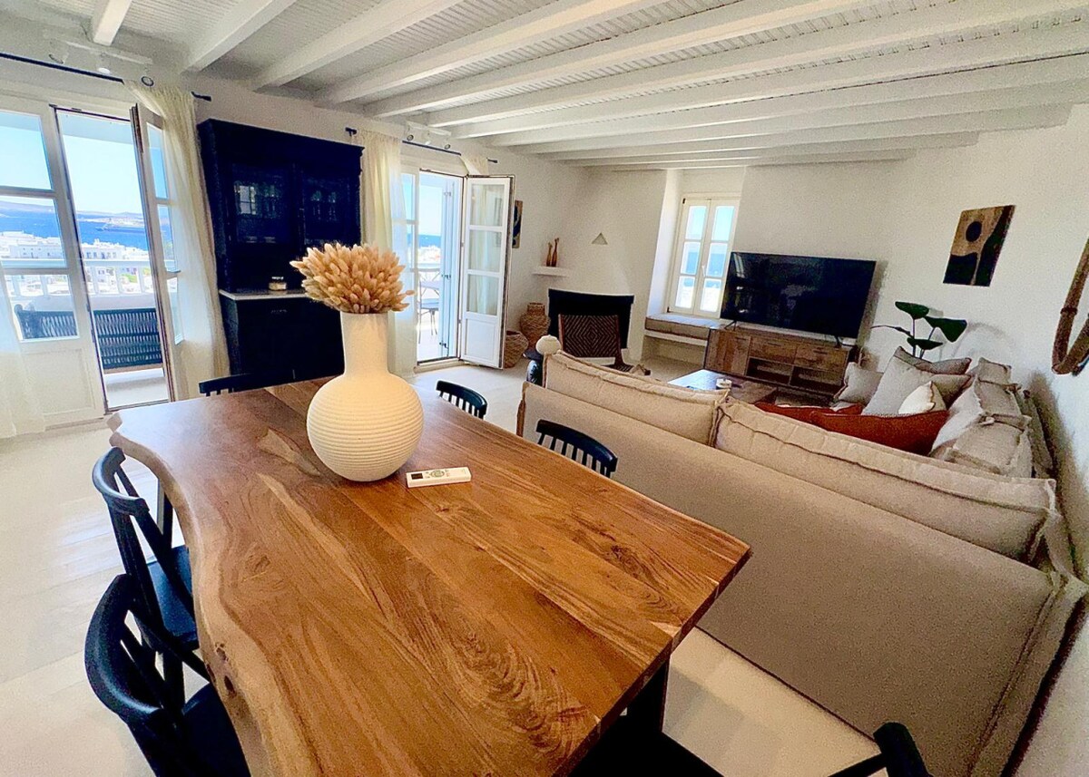 One Manto Square is a classical mansion house set over 2 floors.The iconic building overlooks the Old Harbor. With verandas on all sides, the property has fabulous town and Aegean views to the nearby islands Tinos and Renia, and is a wonderful place to watch the famous Mykonos sunsets. One Manto Deluxe is the upper floor apartment and can accommodate up to 5 guests.