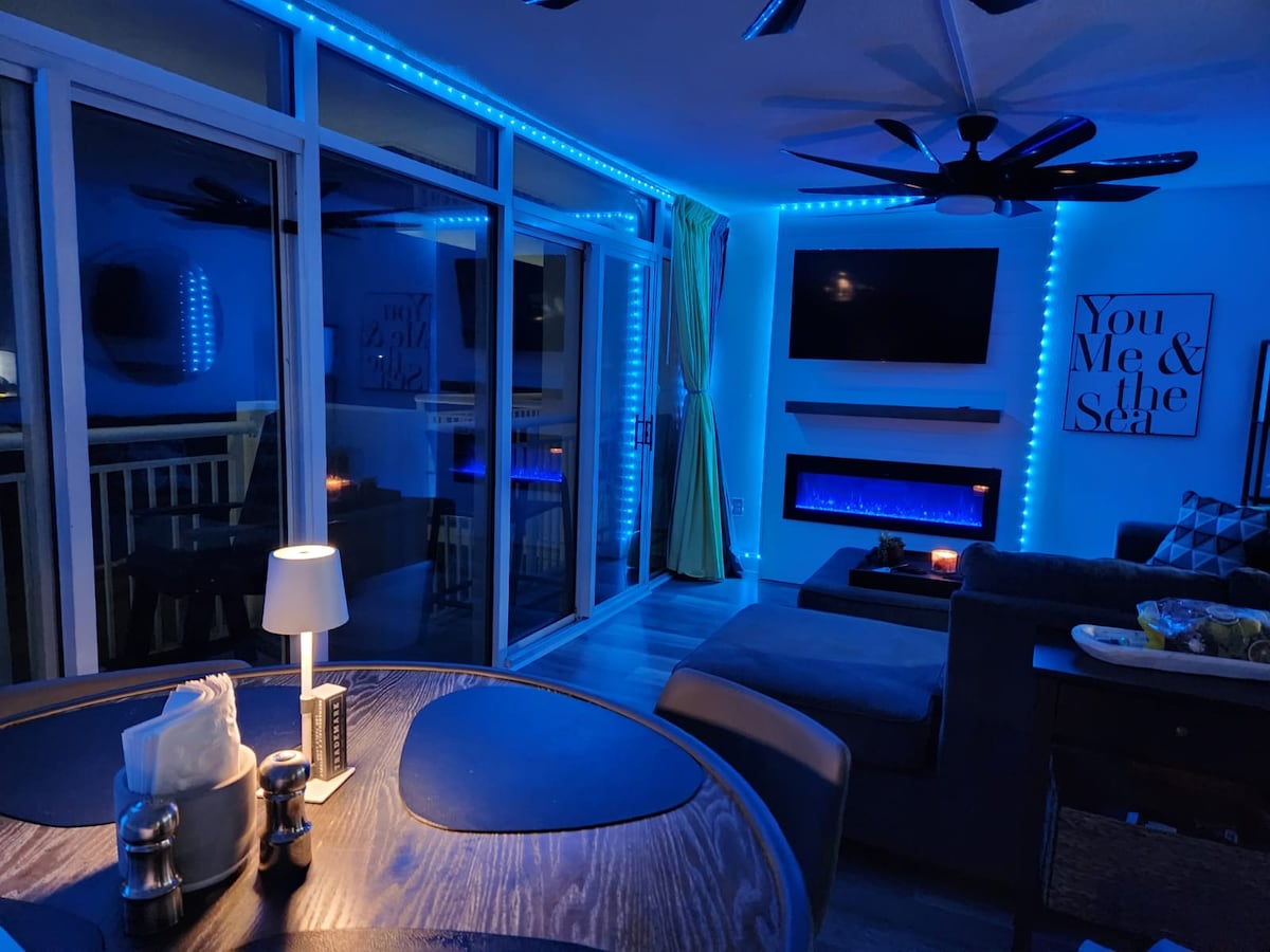 Priveliști spectaculoase din fiecare cameră în acest apartament unic, 2 paturi, 2 băi, cu balcon privat mare! Fiecare dormitor are un pat matrimonial, un televizor inteligent mare, un dulap și lenjerie de pat proaspătă. Fiecare dintre băile curate care scârțâie au dușuri cu faianță, șampon, balsam, săpun și prosoape curate. Bucătăria este aprovizionată cu oale și tigăi, farfurii, căni, pahare, tacâmuri, keurig, blender și câteva condimente. Scaune de plajă, umbrelă, prosoape de plajă, răcitor și coș de plajă incluse! Locuința ta de pe plajă te așteaptă!