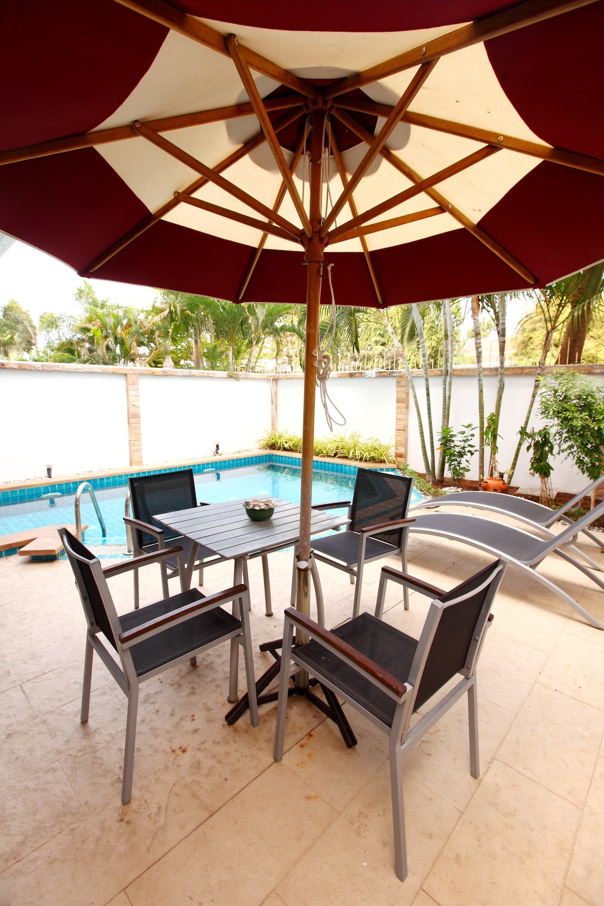 Fără taxe de servicii Airbnb! Vilă privată de lux cu 1 dormitor, cu piscină, într-o proprietate securizată, cu pază non-stop. Complet remodelat și mobilat profesional pentru un sejur relaxant. Ideal pentru cupluri sau familii mici. Bucură-te de propria piscină privată, plus acces la bistroul, barul, piscina comună și clubul proprietății. Satul Jomtien cu acces facil la tot, la doar 800 m de plajă! Perfect pentru o escapadă liniștită și privată.