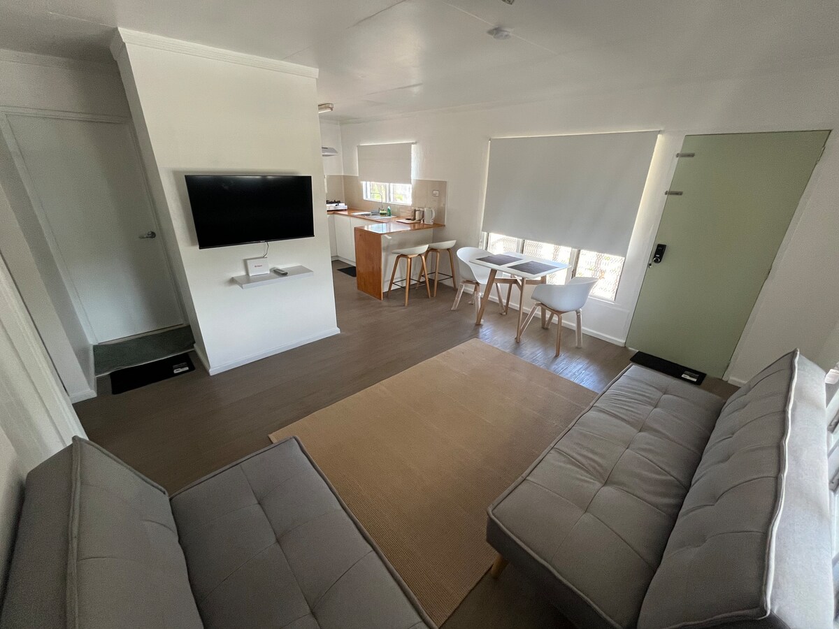 O locuință modernă și confortabilă, cu tot ce îți trebuie pentru o ședere confortabilă. Spațiul are o zonă de living luminoasă, cu o canapea și TV, o bucătărie complet utilată, cu frigider, aragaz și cuptor cu microunde, plus o zonă de luat masa pentru mese comune. Aerul condiționat menține locuința răcoroasă, iar ferestrele mari oferă multă lumină. Perfect pentru cupluri, persoane care călătoresc singure sau grupuri mici care caută un loc de cazare curat și relaxant.