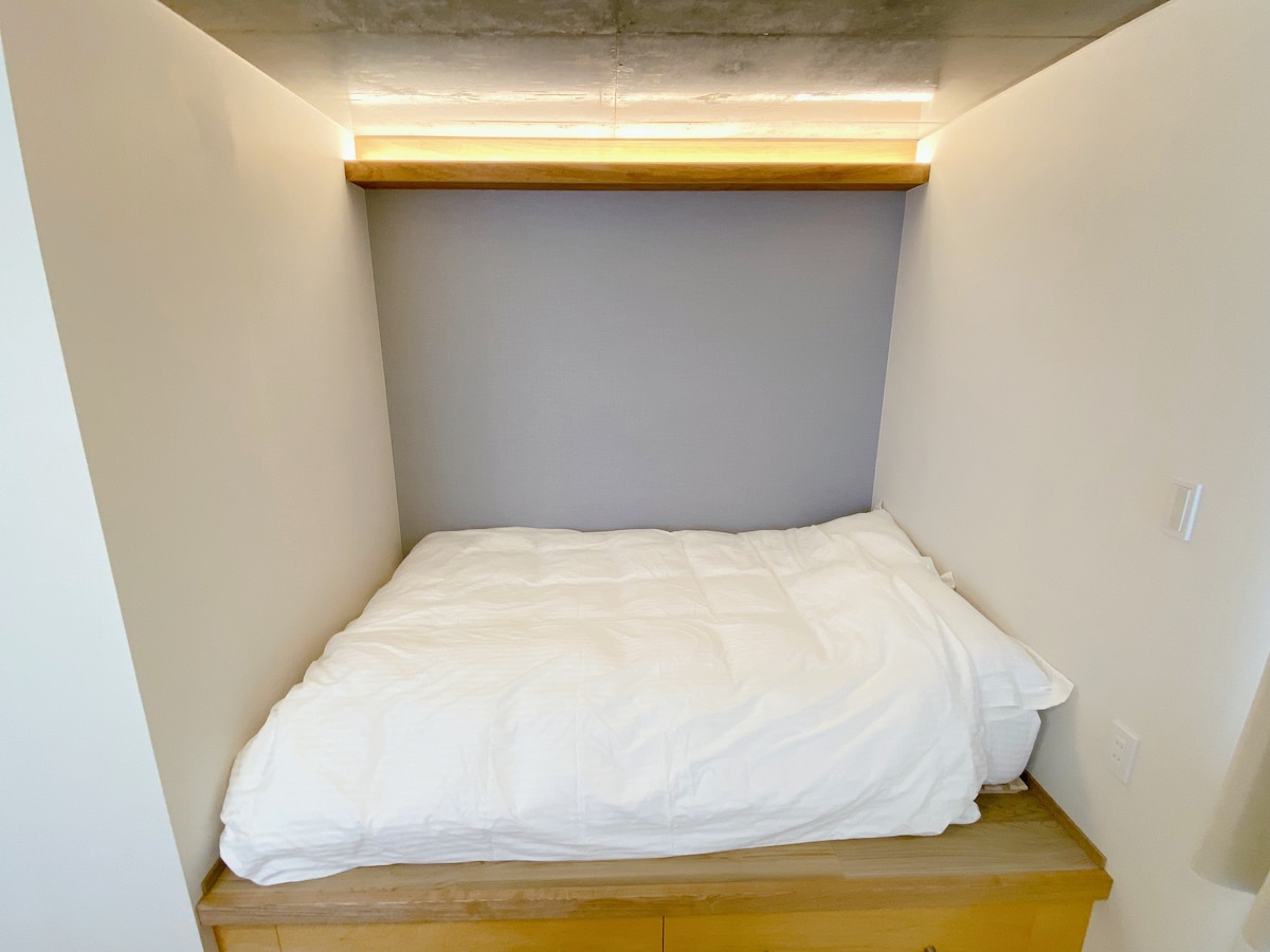 Un loft liniștit, minimalist, la doar o stație de Shibuya și Roppongi-, perfect pentru persoanele care călătoresc singure sau pentru lucrul la distanță. Dispunând de Wi-Fi rapid, un scaun Aeron și un pat dublu compact (150×210 cm)- ideal pentru o persoană, confortabil pentru două persoane. Baia din sticlă și pereții eleganți din beton îi conferă o margine modernă (notă: condens de iarnă - doar pornește ventilatorul băii). Deși nu există dulap, spațiul se potrivește pentru patru valize mari și include o bară de agățat și zece cârlige de perete pentru a păstra lucrurile ordonate. Serviciu de spălătorie săptămânal.