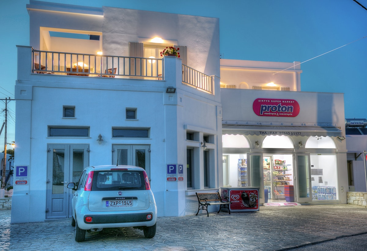 Studio ușor în sistem self-catering la primul etaj, cu vedere parțială la mare și un balcon însorit. Este situat într-o zonă liniștită, la mai puțin de 1 km de portul principal Parikia și la doar 500 de metri de malul mării principal al orașului, unde poți găsi multe restaurante și cafenele. La câțiva metri de studio, poți ajunge la plajă. Stația de autobuz este la câțiva metri distanță. Poate găzdui până la 2 persoane.