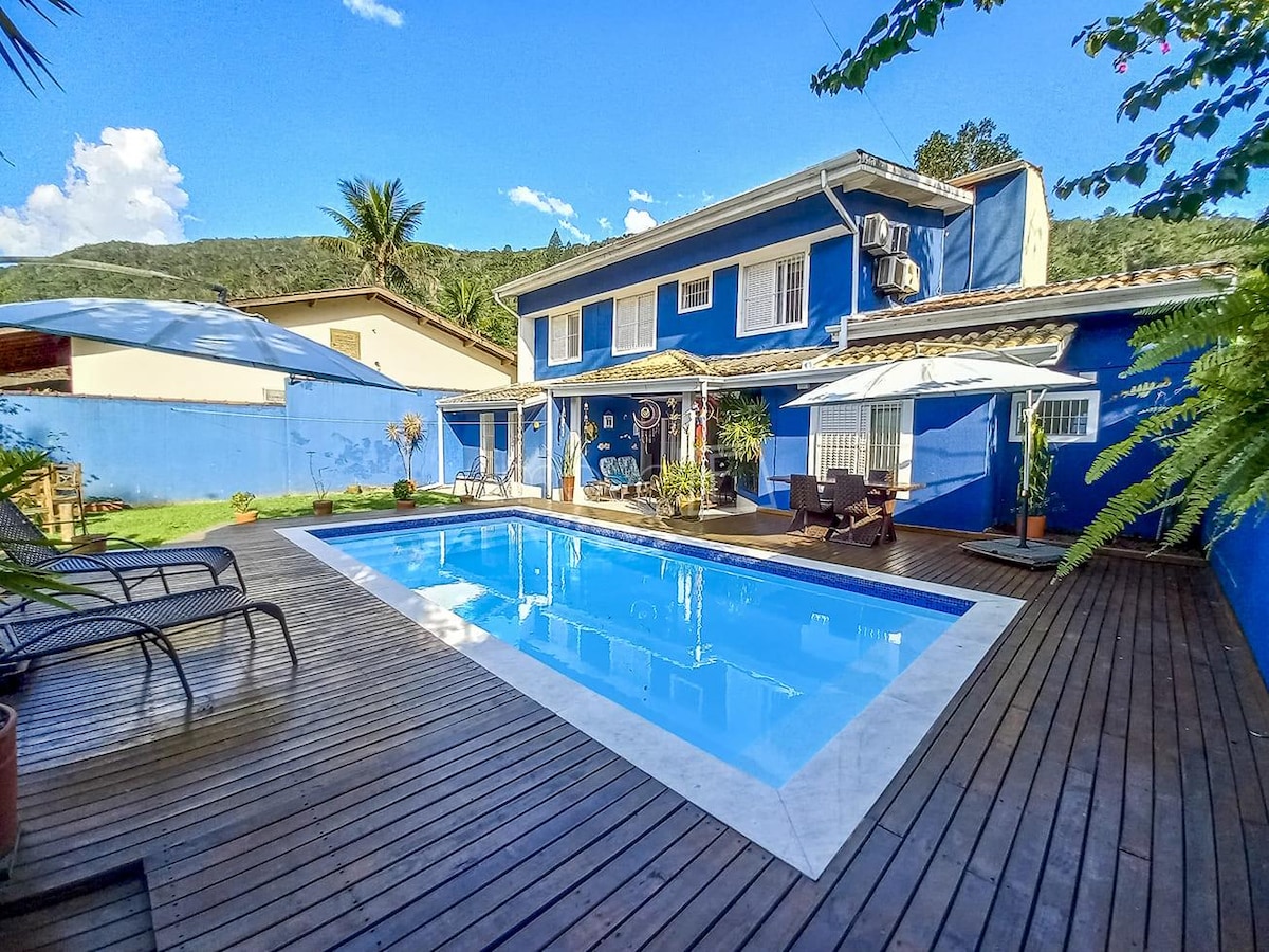 Casa nova 50mts do mar dentro do condomínio Salga na Praia da Lagoinha - Ubatuba - SP . Casa toda climatizada com 5 suítes ( sendo 1 no térreo ) completa onde você poderá desfrutar da sua piscina aquecida ( 30oC o ano todo e com cerca de proteção ) e uma área gourmet completa onde você poderá escolher entre fazer seu churrasco em uma churrasqueira à gás ou à carvão Praia super tranquila, familiar e ótima para crianças. Tem 2 guarda-sóis e 8 cadeiras de praia Acomoda até 15 pessoas Possui Wi-Fi