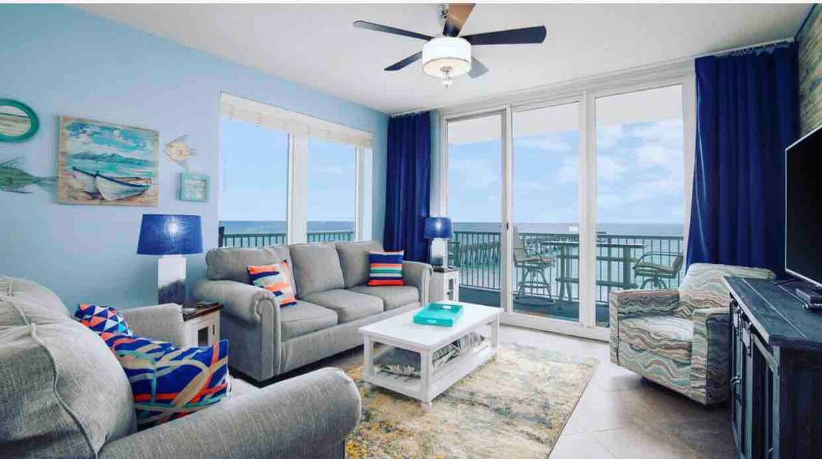 Frumos apartament cu 1 dormitor și 1,5 băi doarme 6 persoane. Adu-ți costumele de baie și pregătește-te să te relaxezi! Apartamentul este la etajul 12, turnul cel mai apropiat de debarcader. - 1 dormitor cu pat king-size, zonă confortabilă supraetajată pentru copii și saltea din spumă cu gel pe o canapea extensibilă. (TOATE SALTELELE SUNT NOI ÎN SEPTEMBRIE 2025). - Toate lenjeriile de pat și prosoapele puse la dispoziție, inclusiv prosoapele de plajă! - 2 scaune de plajă, 2 plăci boogie și o umbrelă de plajă incluse - Mașină de spălat și uscător automat de rufe - Bucătărie complet utilată pentru a te bucura de cină cu priveliște - Wi-Fi și cablu