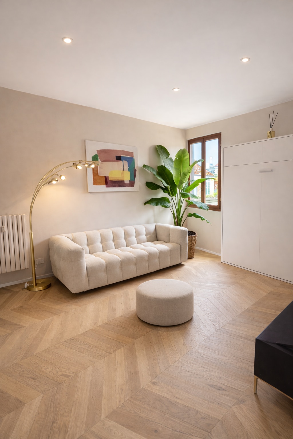 This cozy three-room apartment is located in a refined historic Art Nouveau building, built in 1912 and designed by the architect Arturo Lonati. The building, located in Via Spartaco, has been carefully restored to keep its original charm intact, while offering all modern comforts. The building houses several apartments and has a reception open every day from 7:00 to 23:30, ready to welcome guests and provide assistance during their stay.