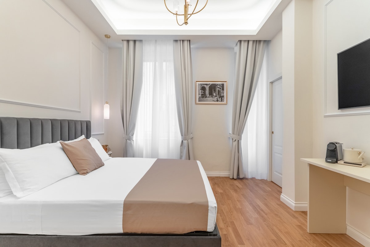 Această suită cu pat de o persoană, cu terasă panoramică, îmbină armonios elementele urbane și naturale, oferind o atmosferă elegantă. Echipat cu Smart TV și un birou pentru confortul tău, este locul ideal pentru a-ți petrece șederea. Baia privată modernă vă oferă un mediu relaxant. Adevăratul punct de atracție este frumoasa terasă pe acoperiș, cu vedere la coloanele San Lorenzo și la bazilică, care vă va oferi seri încântătoare.