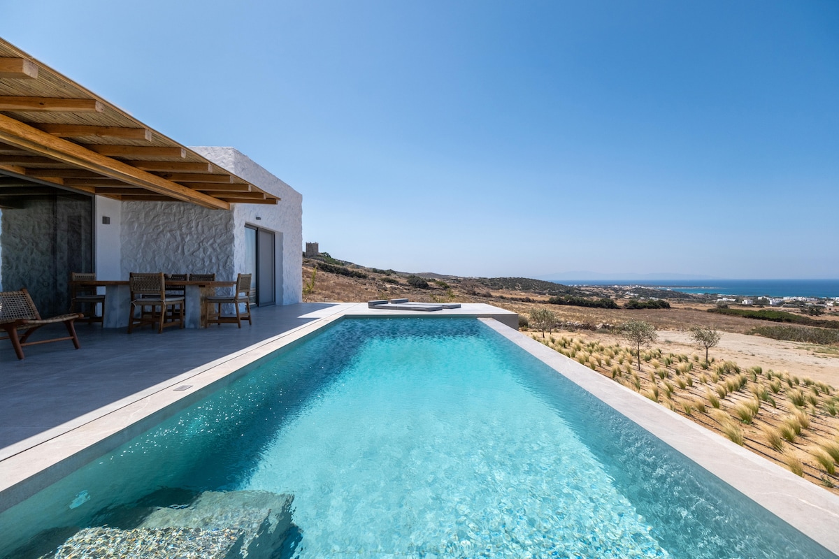 Modern Cycladic Designed and Comfortable House with incredible light and spectacular views located in a privileged environment with one bedroom and big terrace! The house is located 2km from Naxos town on the hill, overlooking Naxos Bay with a breathtaking view. This cozy house offers you everything for your holidays! The house is built on a huge rock and you have garden, a very big terrace with barbeque, pergolas, built sofas, and your own mini pool! Recommended from Conde Nast traveller!