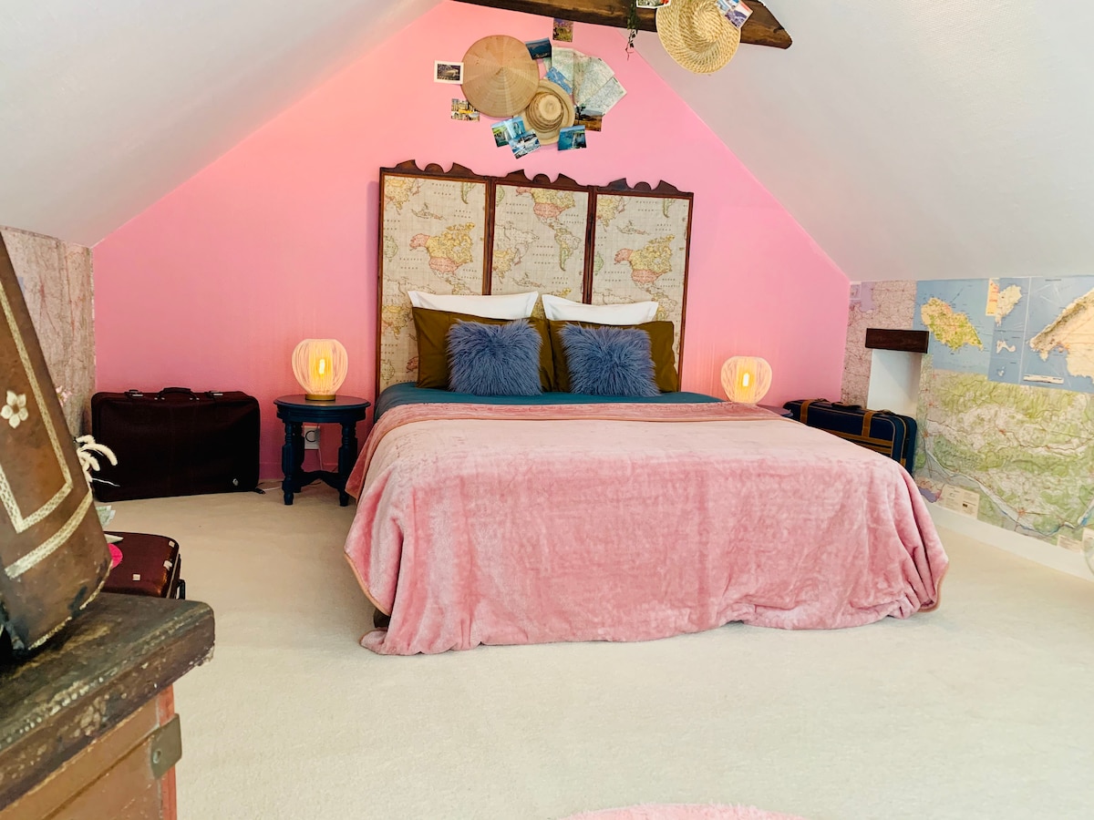 Lasă-te sedus de această cameră foarte luminoasă, baie în apropiere, tavă de bun venit pentru cafea/ceai/ceai din plante în camera ta. Disponibil, un cub cu mai multe buzunare + prize direct pe noptieră, 2 sertare ale dulapului, un sertar cu documentație, planuri, pliante ale regiunii, un suport de uscare pe radiator, un pat pentru copii, dacă este necesar, întreabă-ne. Dormitorul are un ventilator/lampă de tavan cu telecomandă și o cheie de la ușa ta. Obloane electrice cu telecomandă.