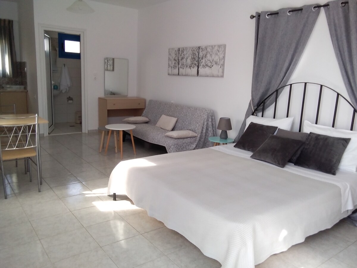 Kalamaki-Sunset 2 is a freshly renovated apartment, 5 minutes far from sea!The apartment has one double bedroom, spacious wardrobe ,bathroom, sofa, dining table and kitchen facilities. Other facilities available are air condition, TV, free wifi,heating and a spacious yard made by stones, to enjoy your breakfast or wine late in the evening. You can also hear the sound of the waves, enjoy view and calmness! Everything you need for perfect holidays...!