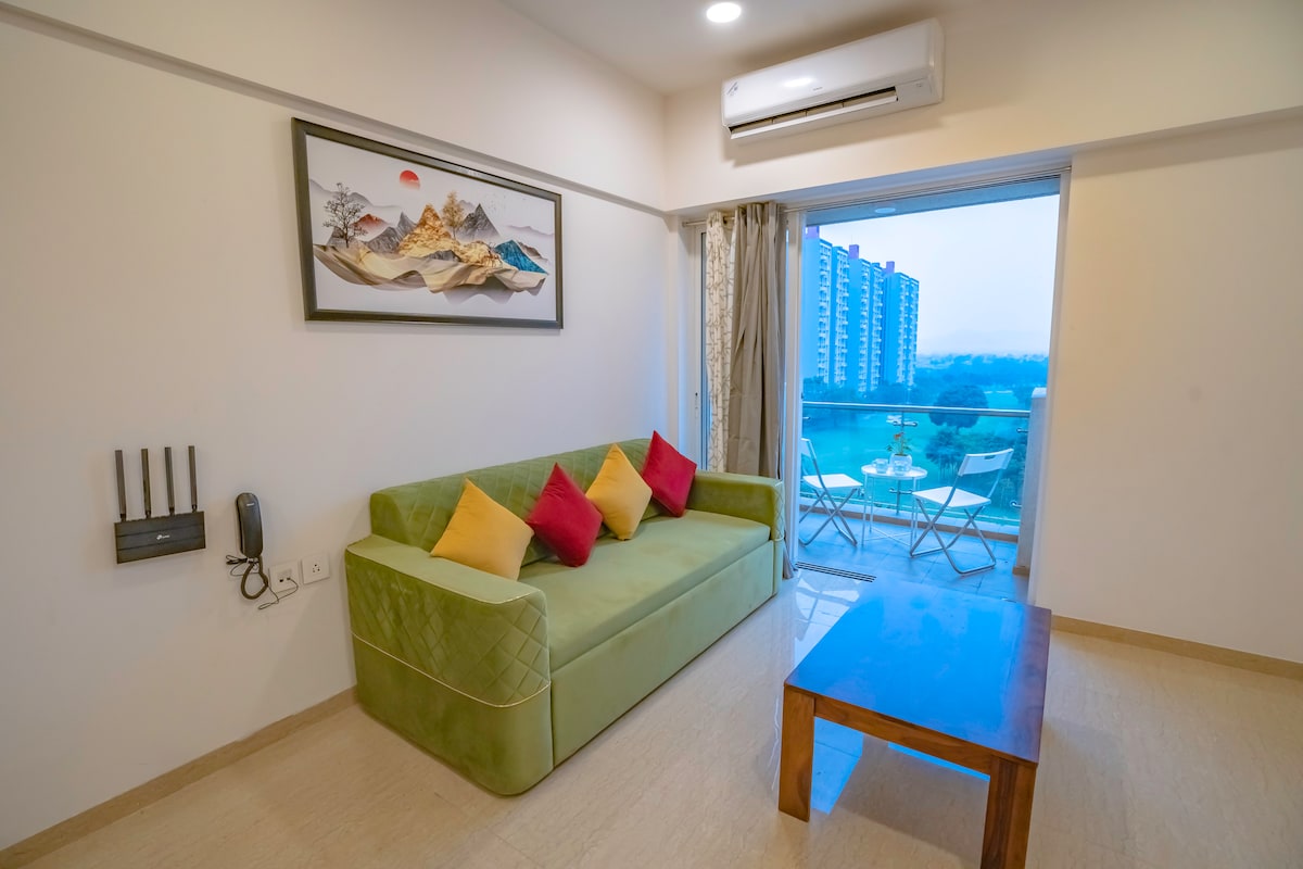 Welcome to a calm and comfortable 1BHK studio ideal for couples, families, solo travelers, friends, and remote workers. Whether you’re here for a quiet weekend, a work-from-home stay, or a longer peaceful break, this home offers the right balance of comfort, greenery, and convenience. The private balcony overlooks lush green surroundings near the golf course. With fast WiFi, OTT apps, and a quiet gated environment, it’s easy to slow down and feel at home.