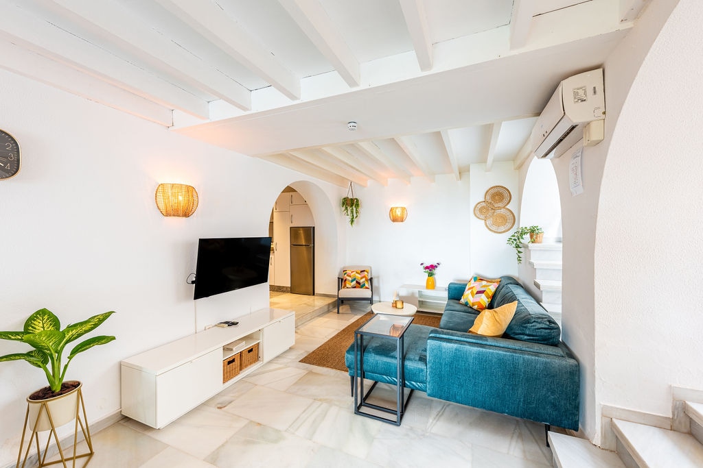 Cabană frumoasă andaluză cu vedere la mare de la balconul spațios într-un cadru pitoresc din Nerja! Grădina privată însorită cu terasă la parter este o zonă minunată în aer liber de care să te bucuri. La doar 6 minute de mers pe jos de plaja și restaurantele Burriana. Cazarea este complet renovată în iunie. Te rugăm să reții că trebuie să mergi pe scări pentru a ajunge la casă și că casa are o scară în spirală pentru a accesa dormitorul de la parter din living. Parcare gratuită disponibilă pe stradă.