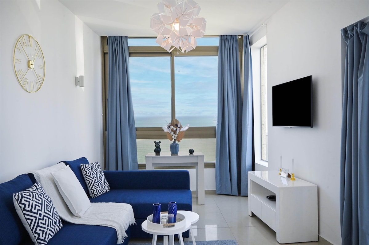 Apartament de lux cu vedere la mare | 5 camere | Jacuzzi | Pe plajă Bine ai venit la apartamentul de vis de pe malul apei din Netanya Te așteaptă un apartament luxos, mare și cu un design meticulos, cu tot ce ai nevoie pentru a te răsfăța cu adevărat Apartamentul are 4 dormitoare spațioase, 2 băi, un living luminos cu TV inteligent, un balcon cu zonă de relaxare și vedere la mare, o bucătărie cușer și complet utilată, inclusiv un frigider, cuptor, cuptor cu microunde, aparat de cafea și chiuvete separate. Apartamentul este situat într-o locație liniștită și centrală, de la clădire există o coborâre la Blue Bay Beach și la 10 minute de mers pe jos de plaja separată Kiryat Tzanez. De asemenea, la câțiva pași sunt restaurante, cafenele, centre comerciale.