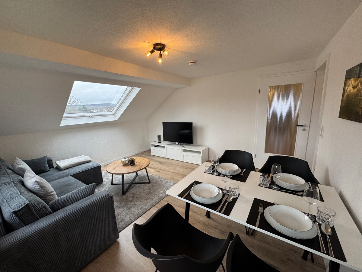 Cazează-te la ultimul etaj al unei case istorice din cărămidă din inima orașului Eissen, complet renovată în 2021. Fosta școală de fete din sat a fost apoi folosită ca fierar și magazin de lăcătușerie ani de zile. Simte flerul rustic chiar și acum, deoarece atelierul de la parter este încă activ uneori. Poate fi accesat separat printr-o scară exterioară, puteți ajunge la apartamentul spațios cu un concept deschis. Spațiul de locuit este la aproximativ 80 de metri distanță.