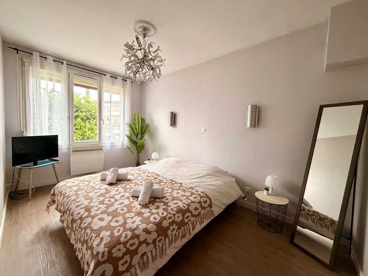 Cet appartement rénové et lumineux est idéalement situé. Étant très proche du centre ville vous bénéficierez de tous les commerces à proximité mais également d'une grande tranquillité. De plus, l'appartement est équipé et propose une vue sans vis-vis. NB : les deux chambres possèdent un lit double + le canapé du salon est adaptable en lit. A proximité à pied : Ecole de gendarmerie. 10min Hôpital. 10 min Centre ville 10min 1 nuit possible sur demande Je reste à votre disposition.